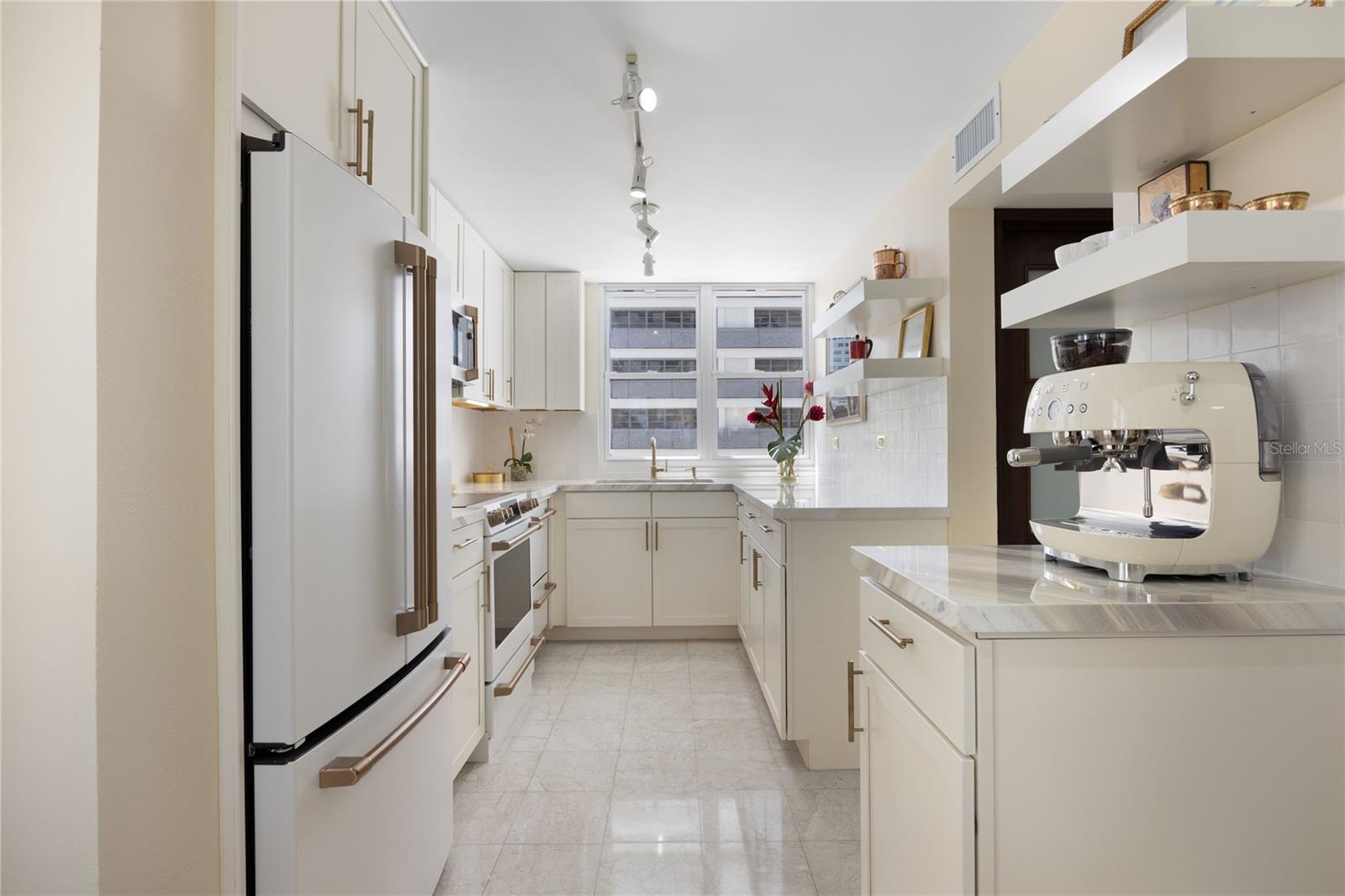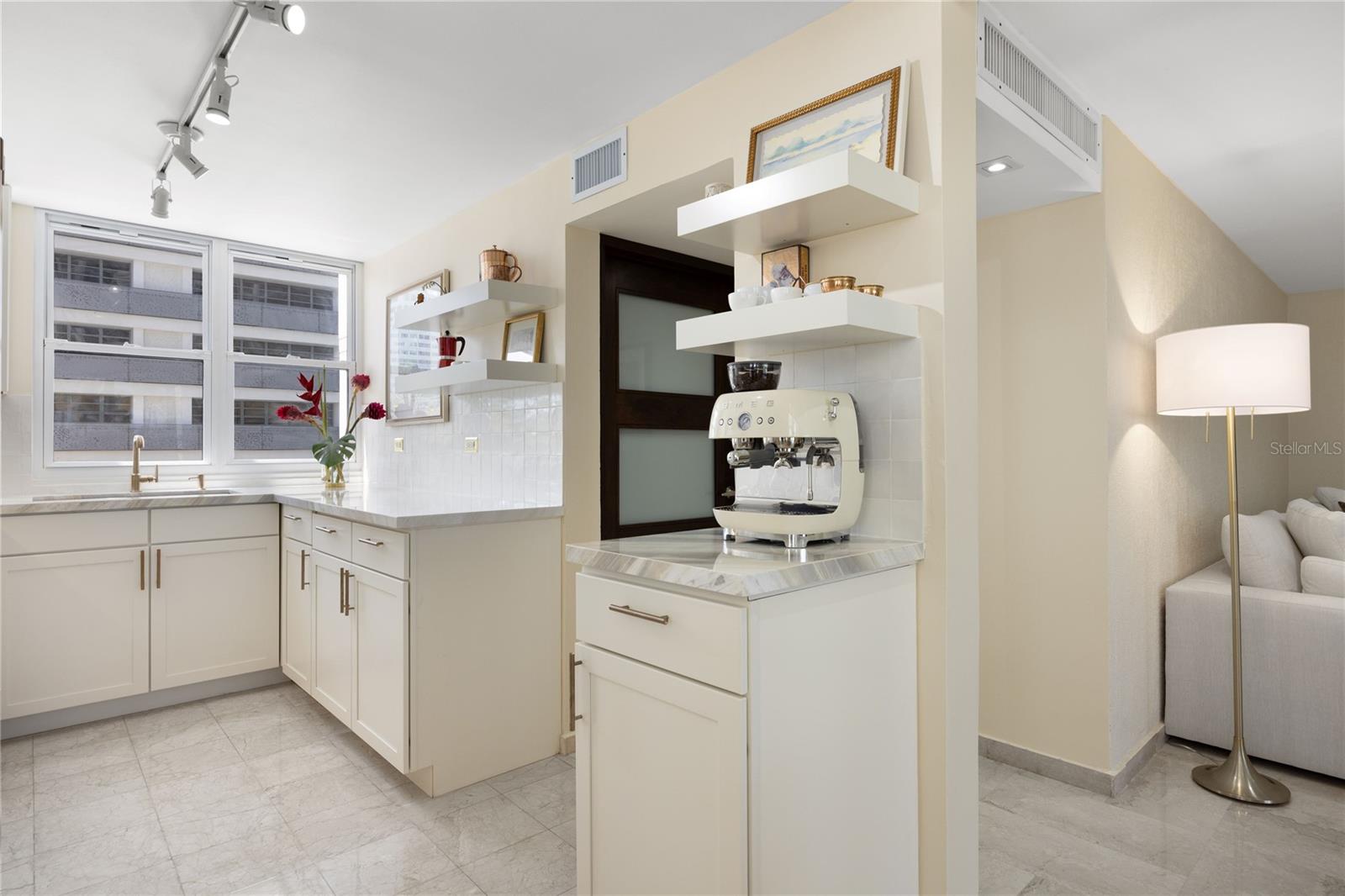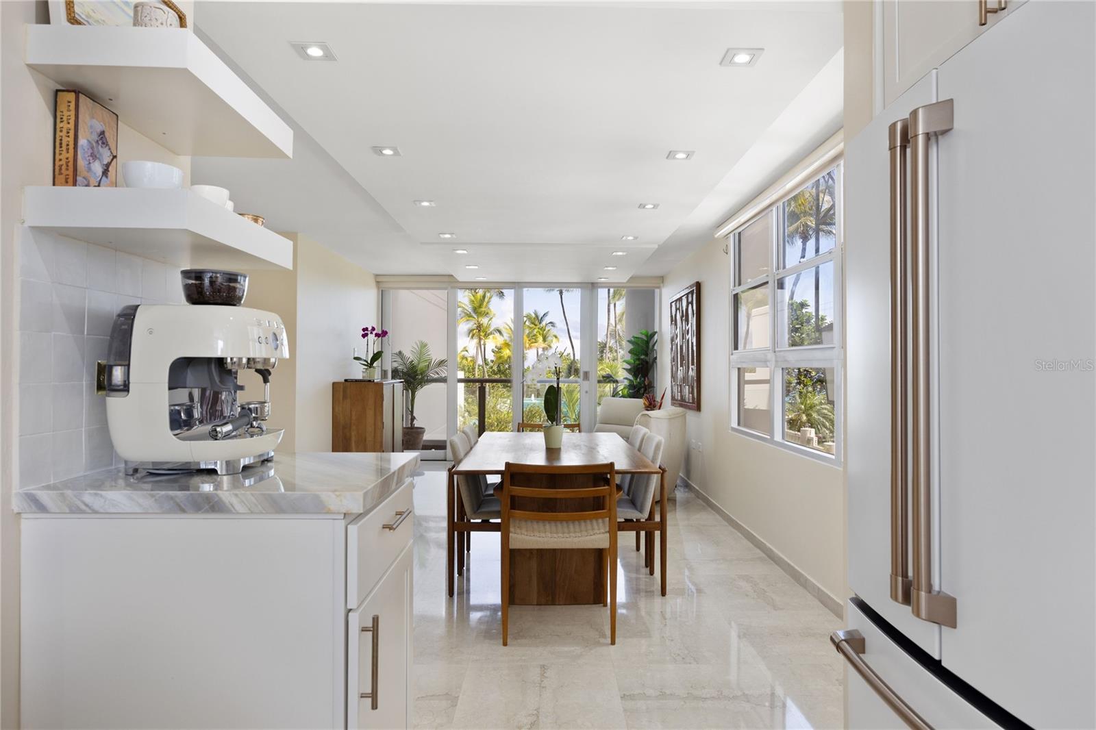 Comfortably sized at 1610 square feet, the residence accommodates three bedrooms, two full bathrooms and a balcony with stunning views of the pool area, palm trees and the turquoise waters beyond. The brand-new kitchen has been entirely reimagined with white marble countertops, white zellige tiles, solid wood cabinetry and matching white appliances. Complete with a Smeg espresso machine, Kitchen Aid blender, tableware and barware, this space is perfectly equipped for everyday rituals or casual hosting. Two large windows, open shelving, sleek marble and a neutral palette combine to create a luminous, inviting space that connects seamlessly to the living and dining areas.