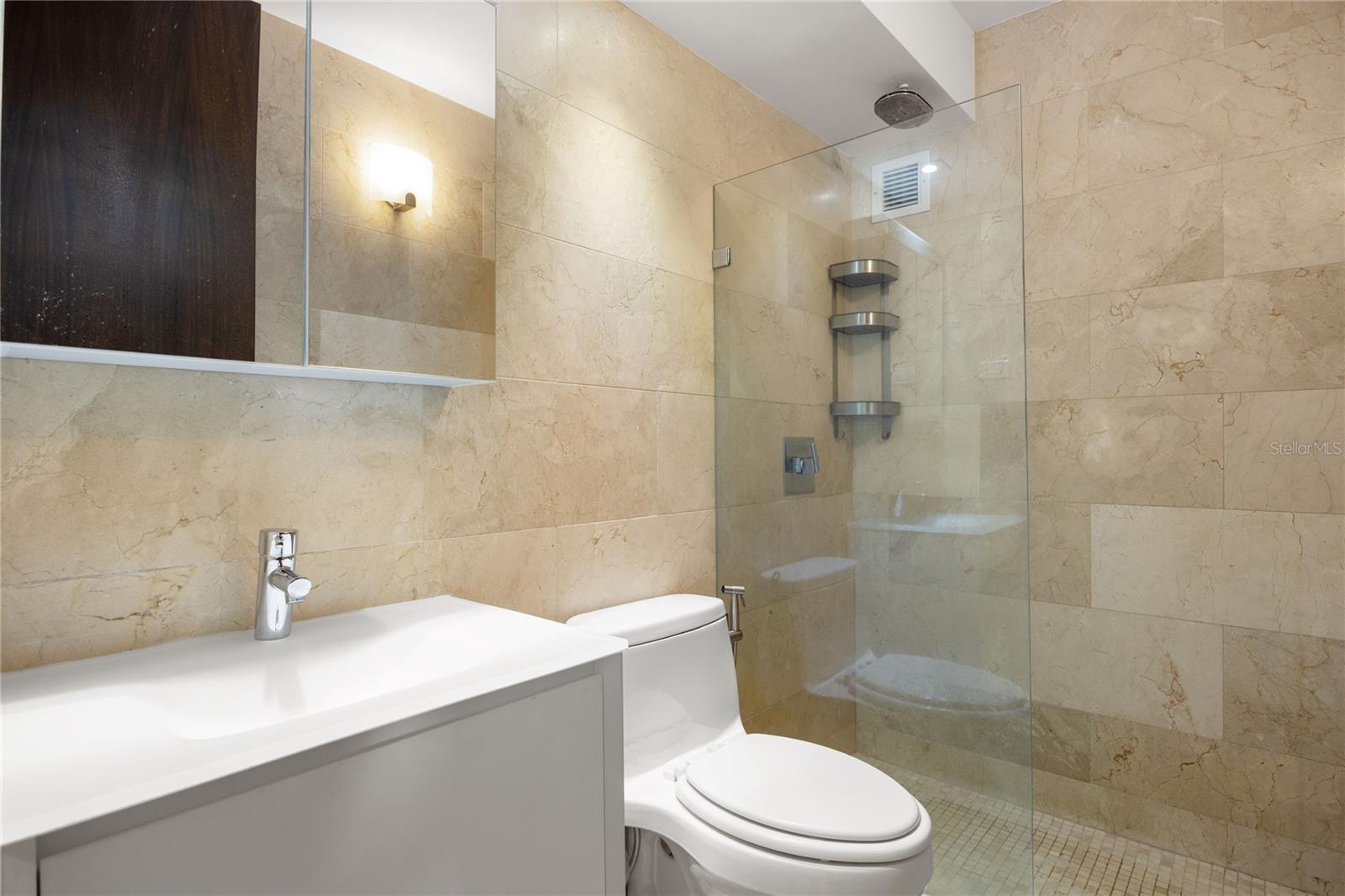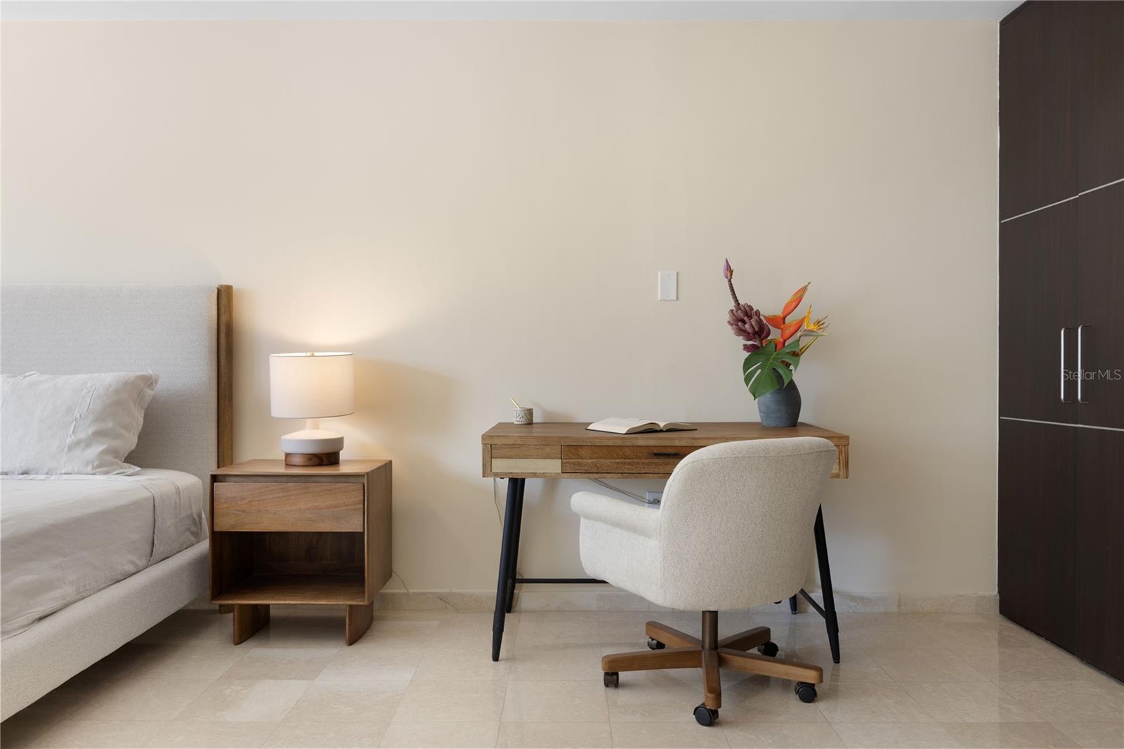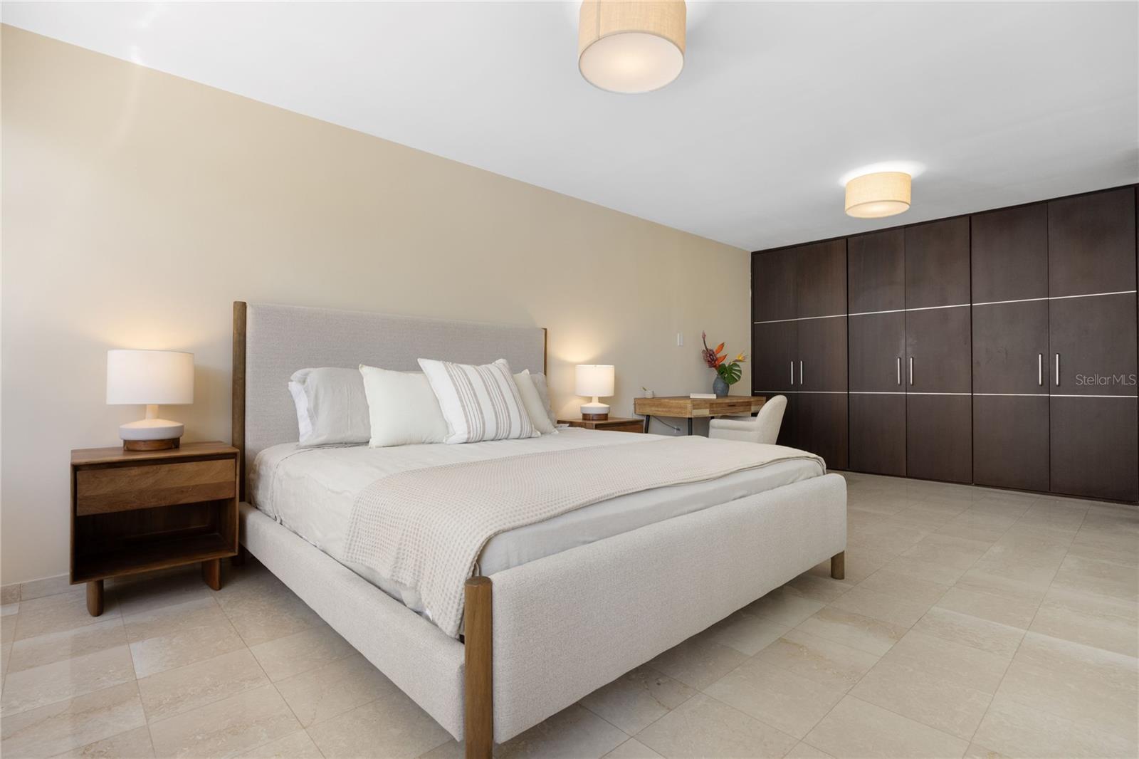 The large, primary suite offers an ensuite bathroom, a brand-new king-sized bed and ample space for a desk or seating area. Two secondary bedrooms are outfitted with queen-sized beds, bedside tables and built-in closets, with a full bathroom located directly across the hall. Both bathrooms have been renovated with timeless marble floors, floating vanities and frameless glass walk-in showers. This residence also includes high-speed internet, two deeded parking spaces and a private storage closet located right next to the main entrance.