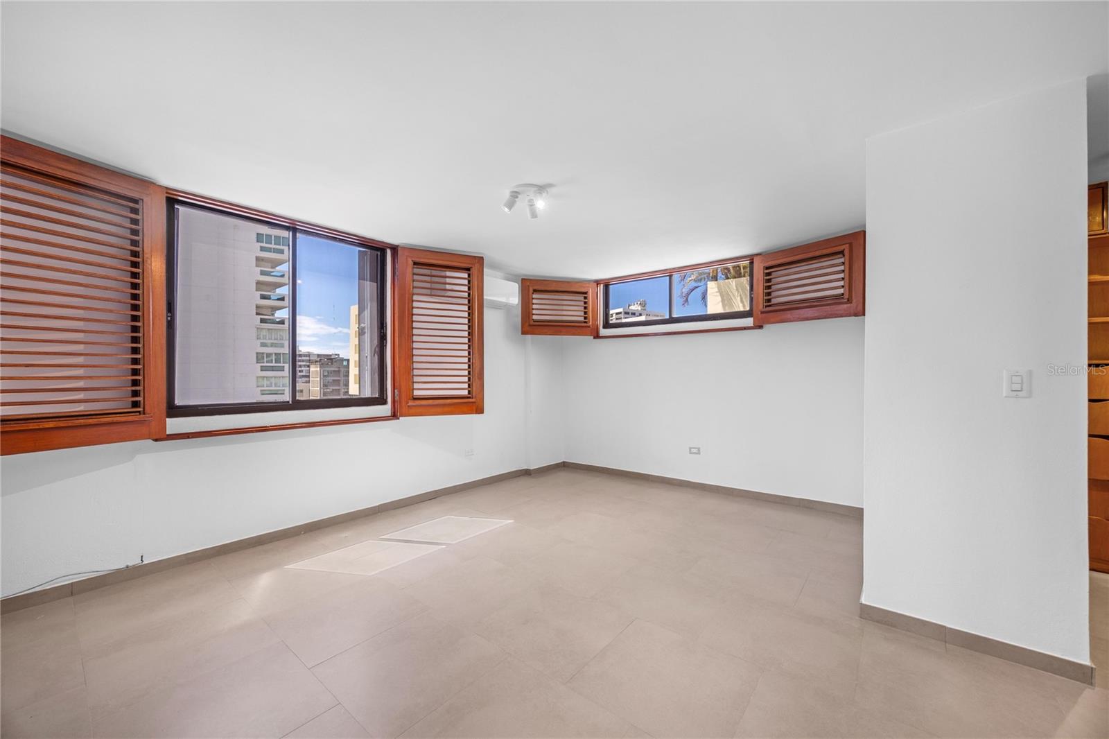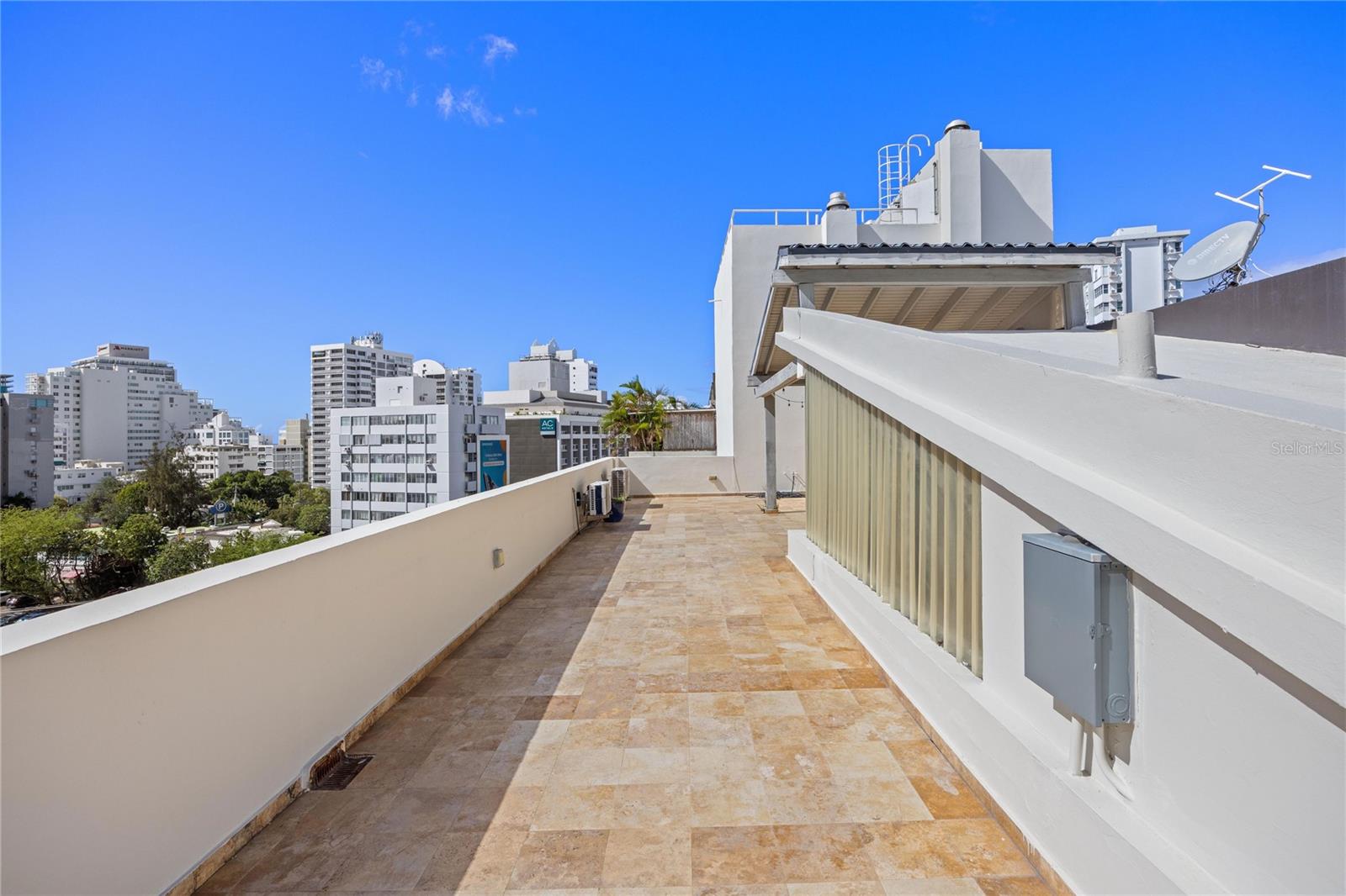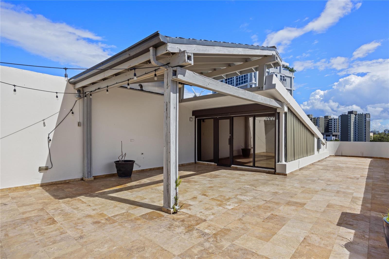 The second level features an expansive terrace—an exceptional rarity in Condado—offering both covered and uncovered areas. The covered portion can be easily enclosed to create an additional bedroom, office, or expanded living space. The open-air terrace provides a private retreat in the heart of the city, ideal for entertaining or creating a personal wellness space.
