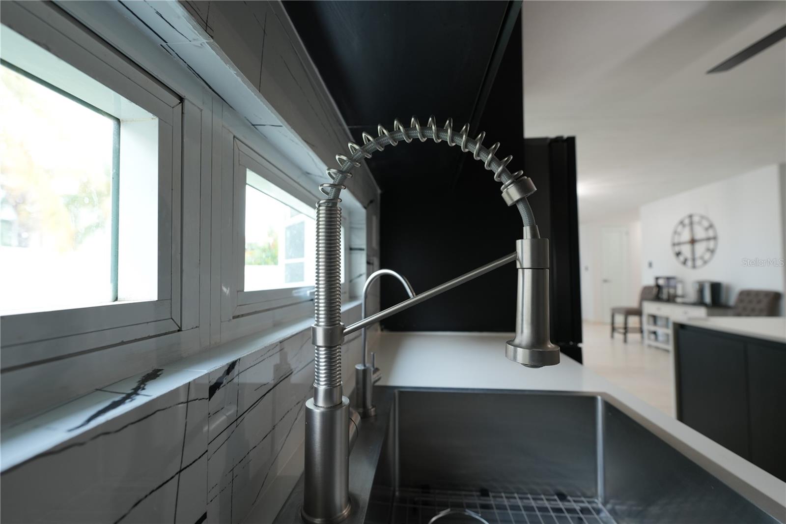 The first level features the living room, dining area, remodeled kitchen, family room or home office, half bath, and interior laundry near the carport access. The updated kitchen includes matte-finish cabinetry, quartz countertops, waterfall-style center island, porcelain backsplash, gas range, and stainless steel appliances. Bathrooms were remodeled with wood-look tile finishes, and glass-enclosed showers. The primary bathroom features a double vanity and shower panel.