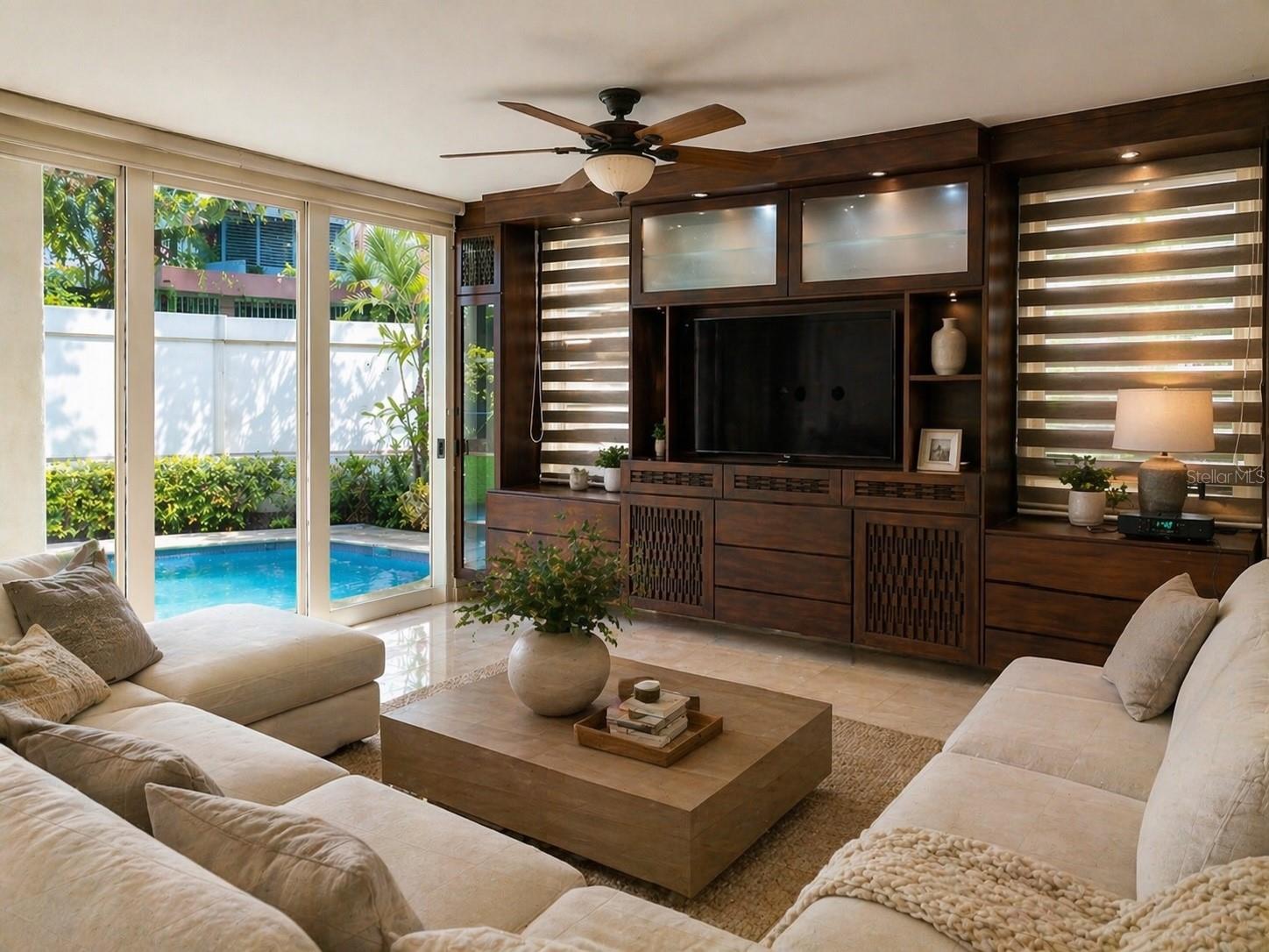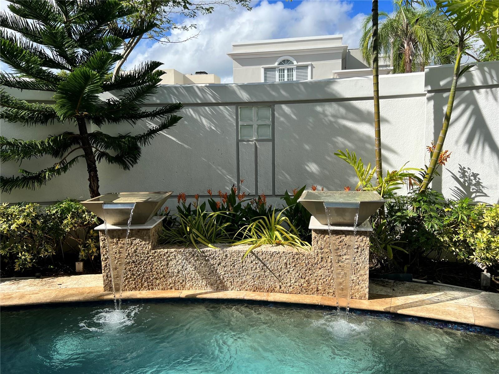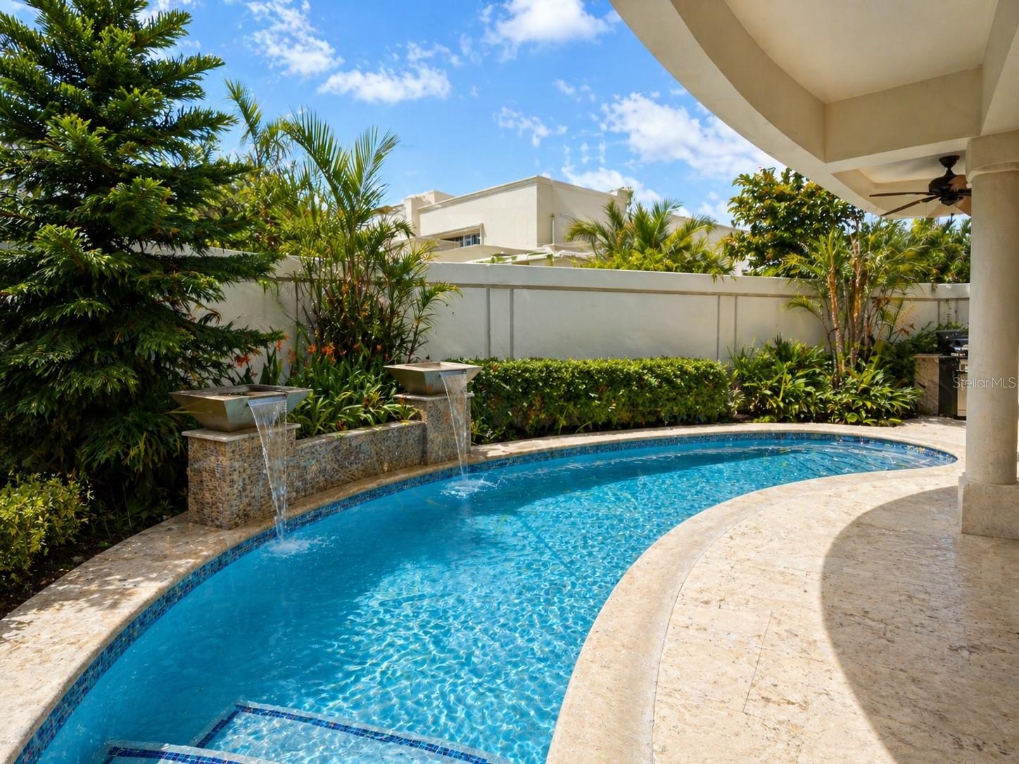 The outdoor area offers a private pool with waterfall and covered terrace, creating a seamless indoor-outdoor living experience—perfect for relaxation or entertaining.