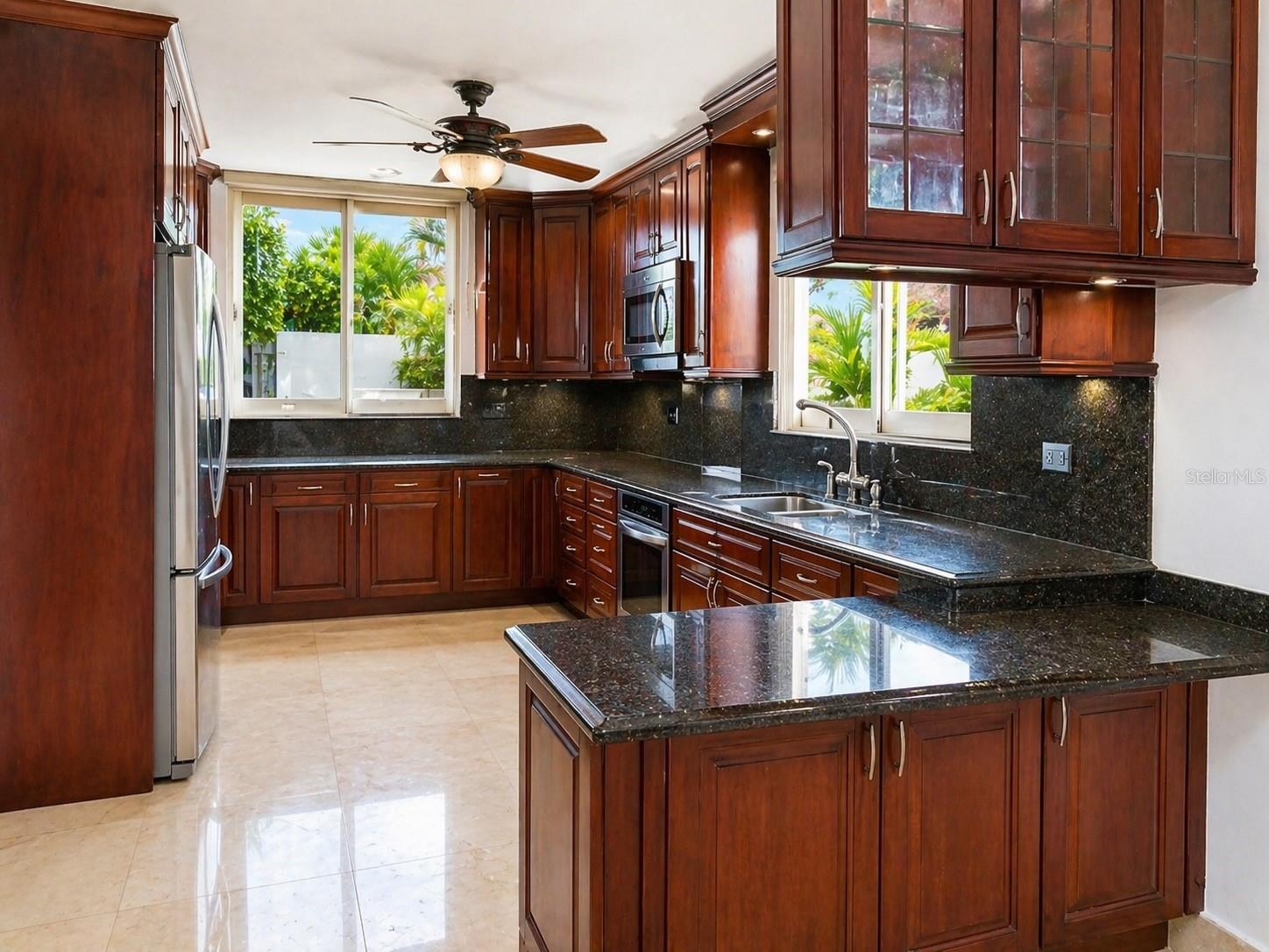 The home showcases marble floors throughout, expansive open living areas, and a fully equipped kitchen with solid wood cabinetry and stone countertops. A second-floor laundry room adds convenience for day-to-day living.