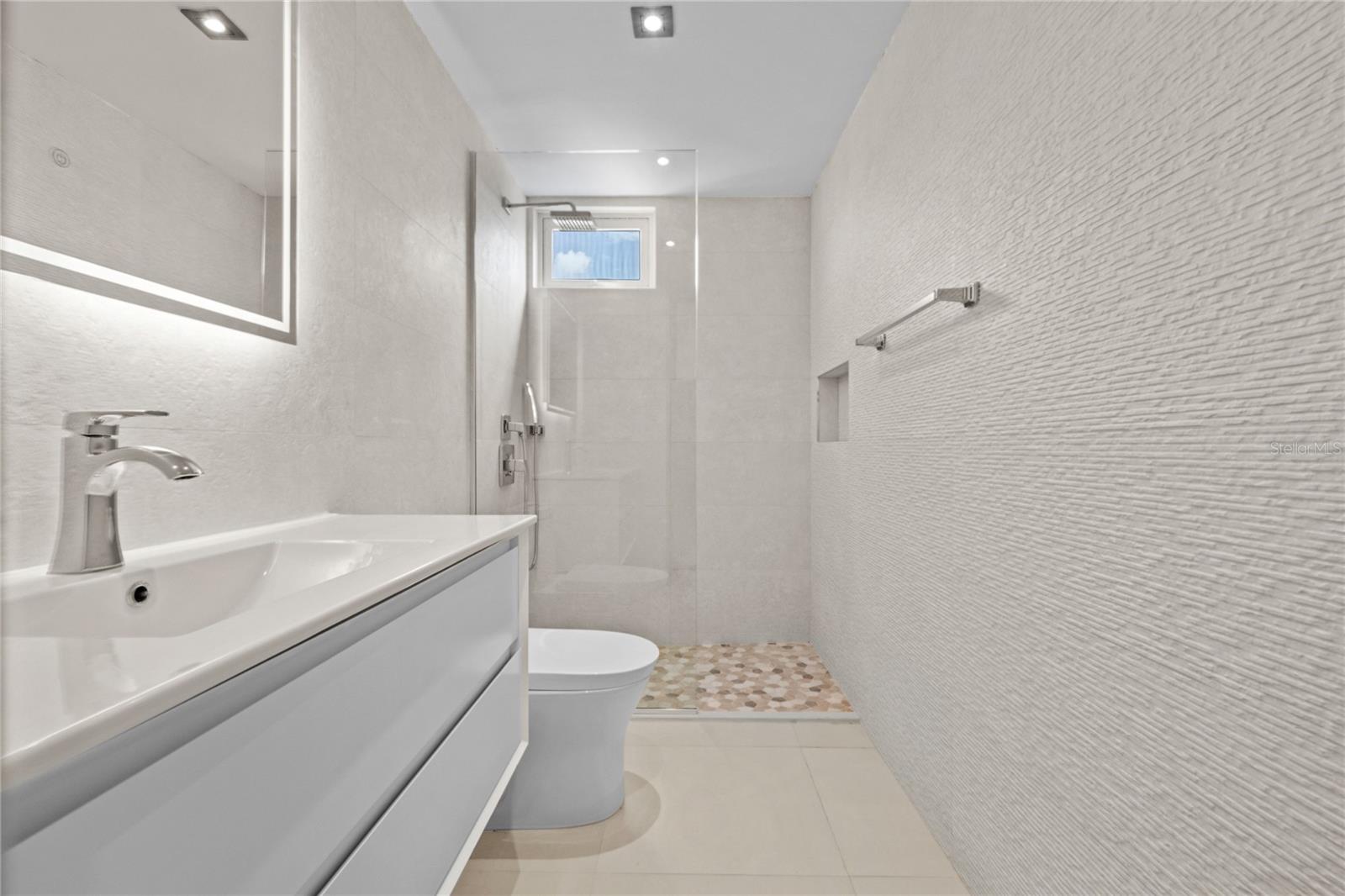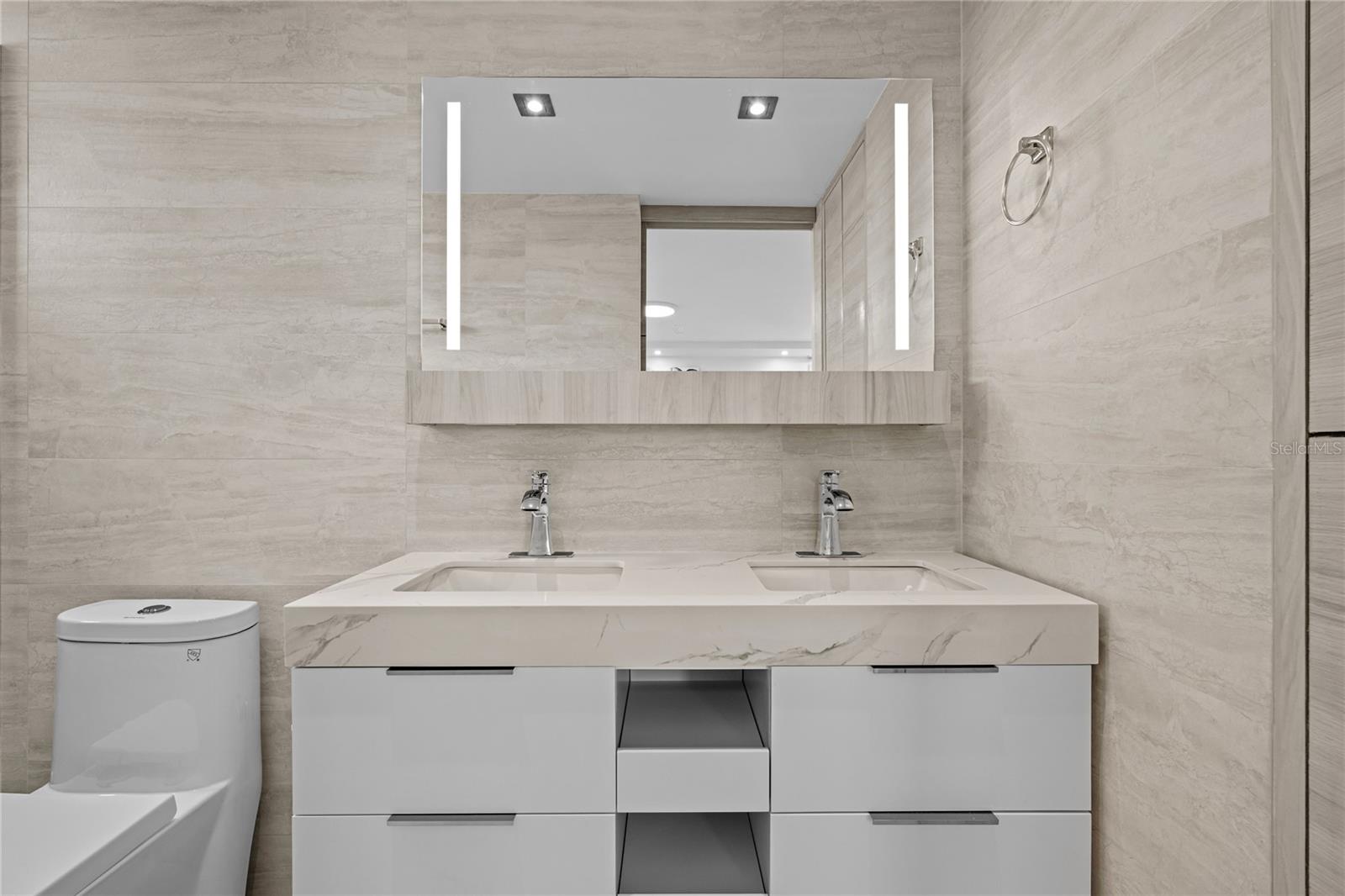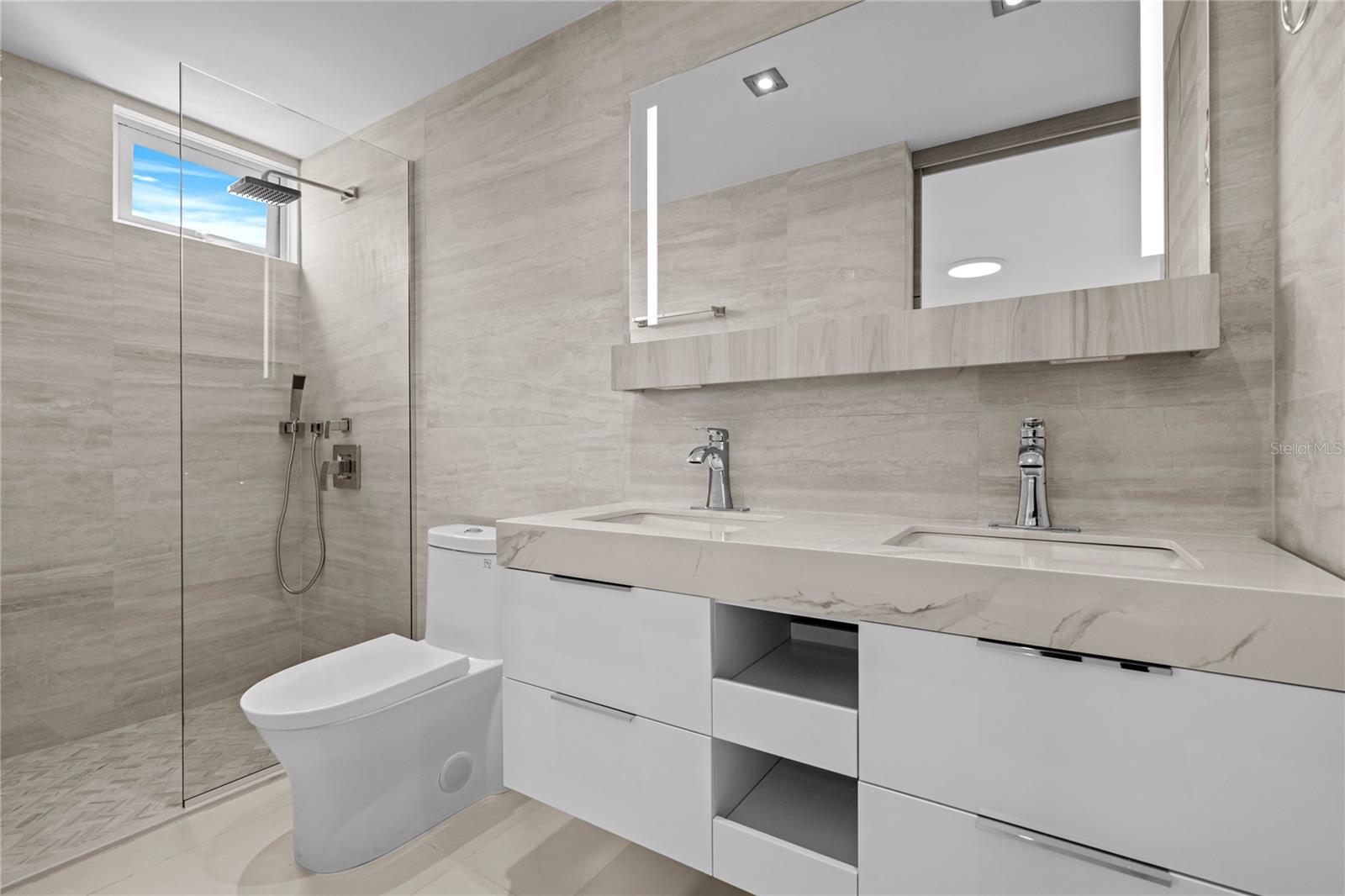 The kitchen is sleek and modern, with polished white marble countertops and cabinetry in a light wood grain that feels as effortless as it is modern. Both bathrooms echo this serene palette in natural textures, with sleek lines, polished fixtures, and the kind of gleaming cleanliness that makes the entire home feel untouched--because it is. You'll be the very first to live in this redefined residence.