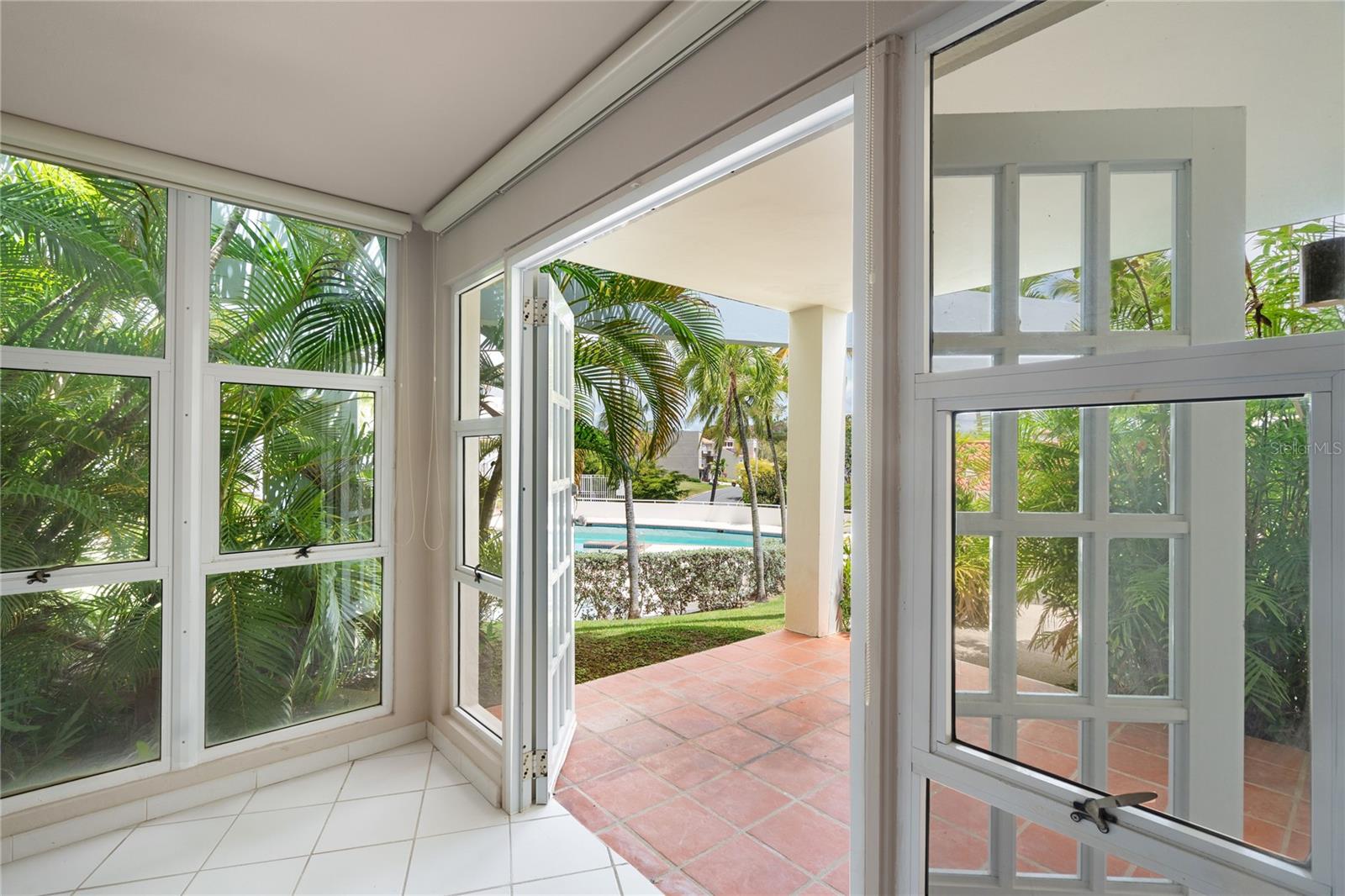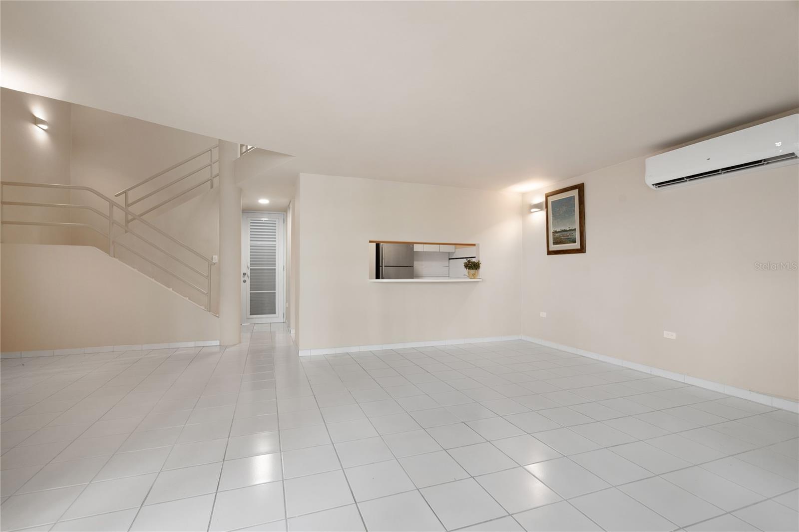 The interior layout is both functional and inviting, with a spacious living and dining area that connects seamlessly to the kitchen. From this level, doors open to a covered terrace and outdoor space, creating a natural extension of the home and allowing for immediate access to the pool area just steps away.