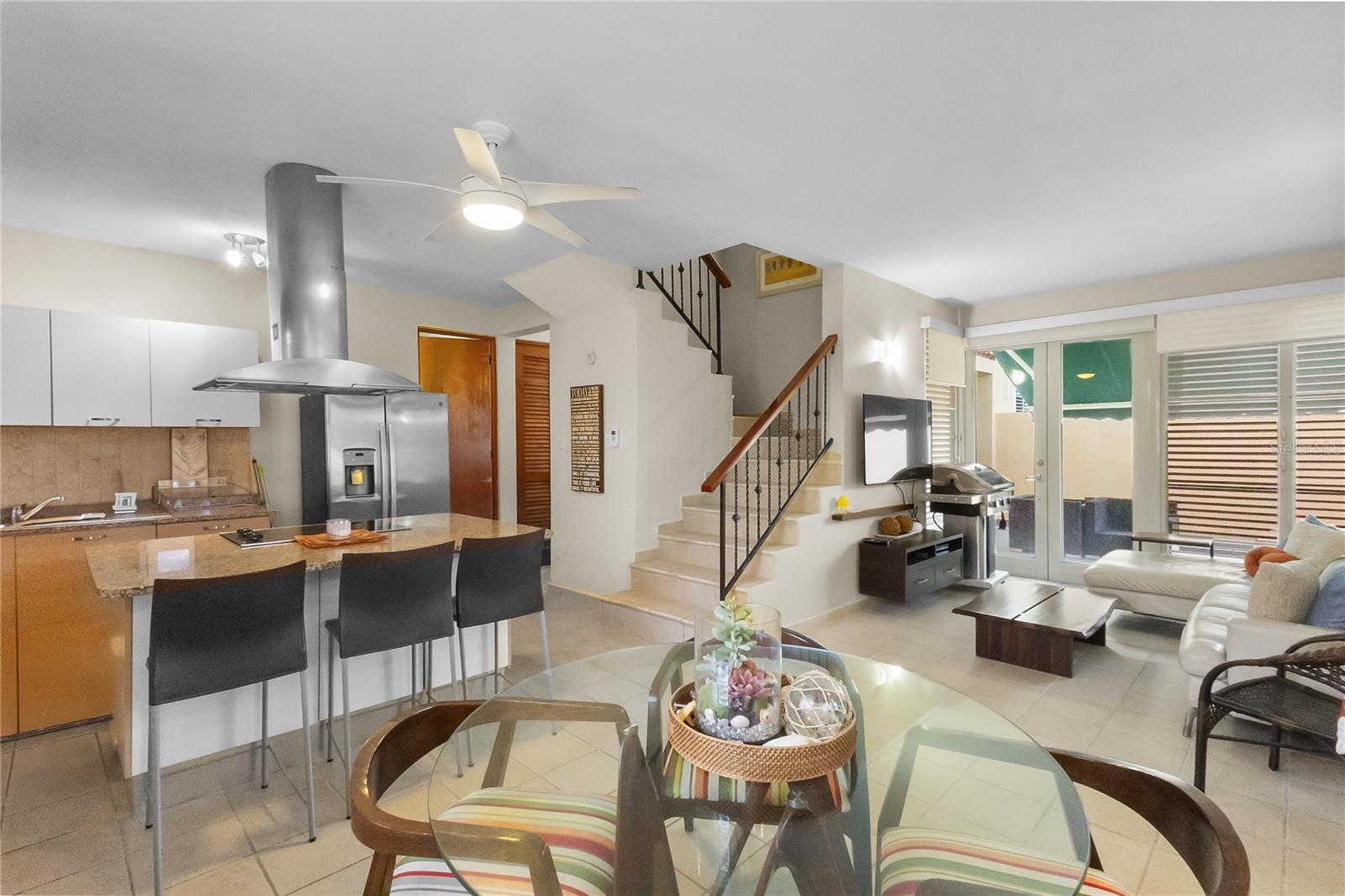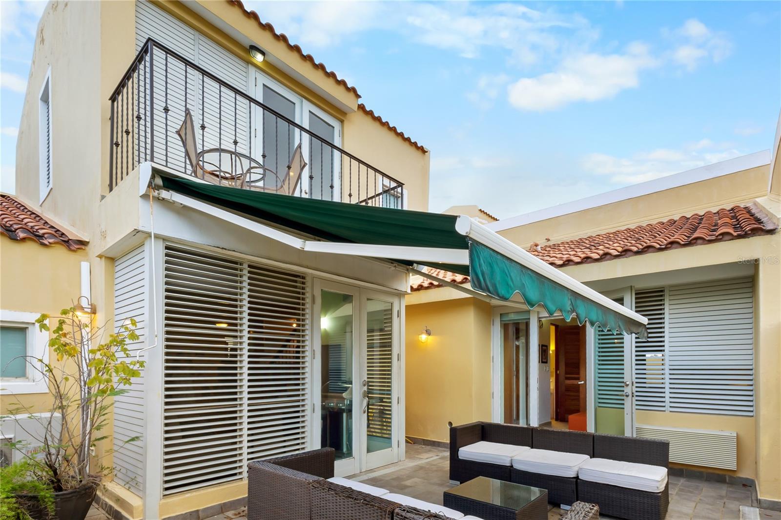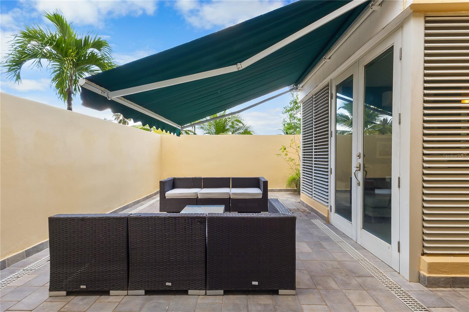 The first floor features two bedrooms and two full bathrooms, a convenient laundry closet, and an open-concept kitchen that flows into the living and dining areas. Step outside to a private patio with retractable awnings, perfect for relaxing or entertaining.