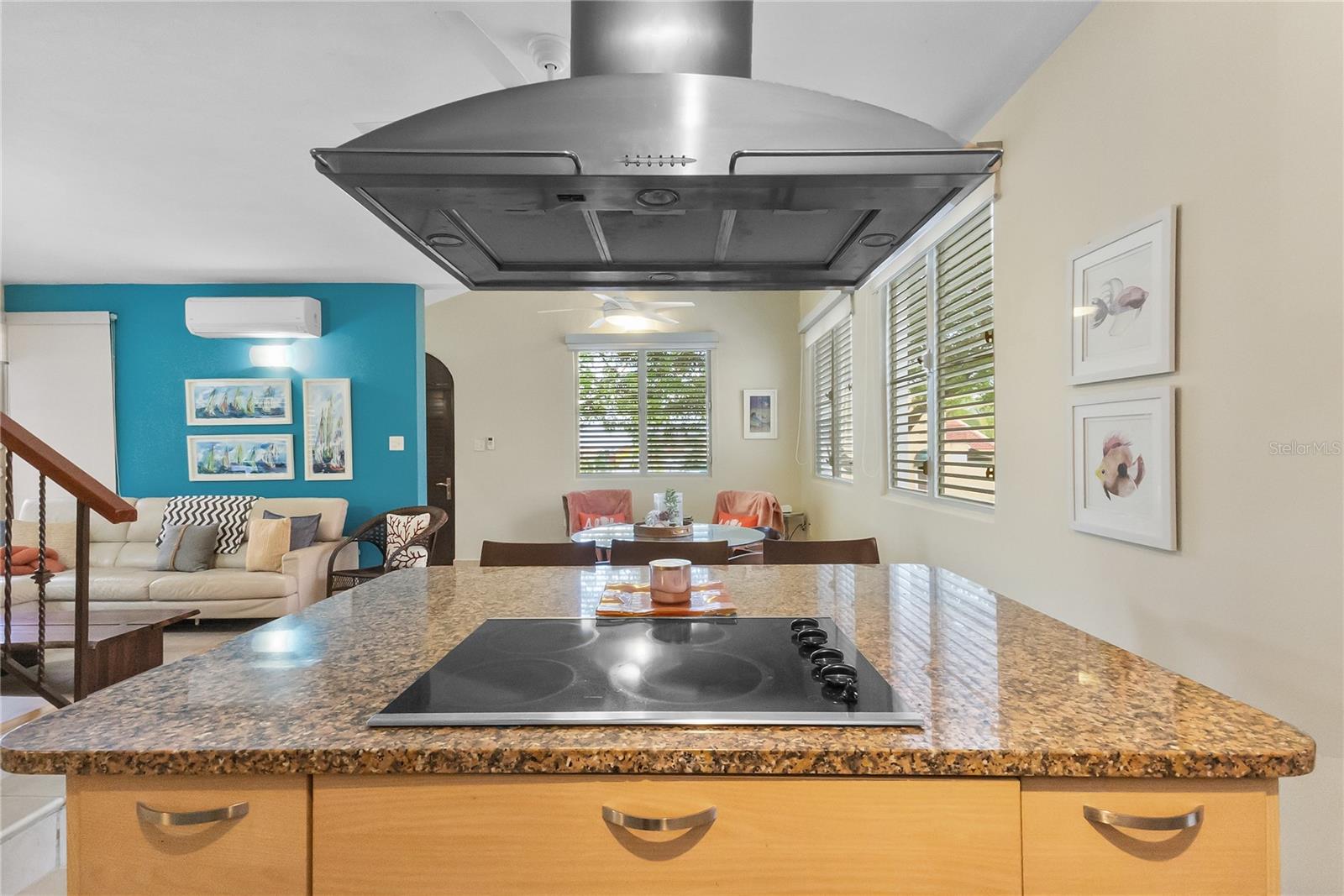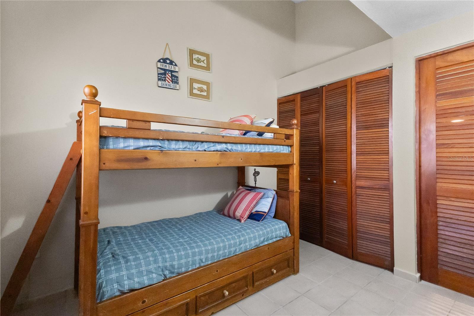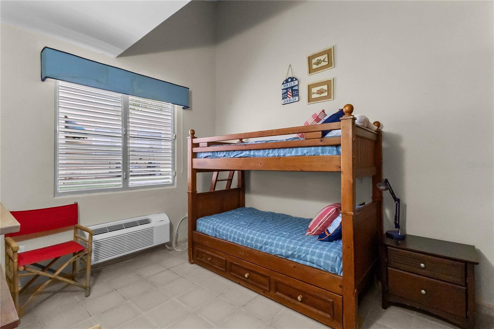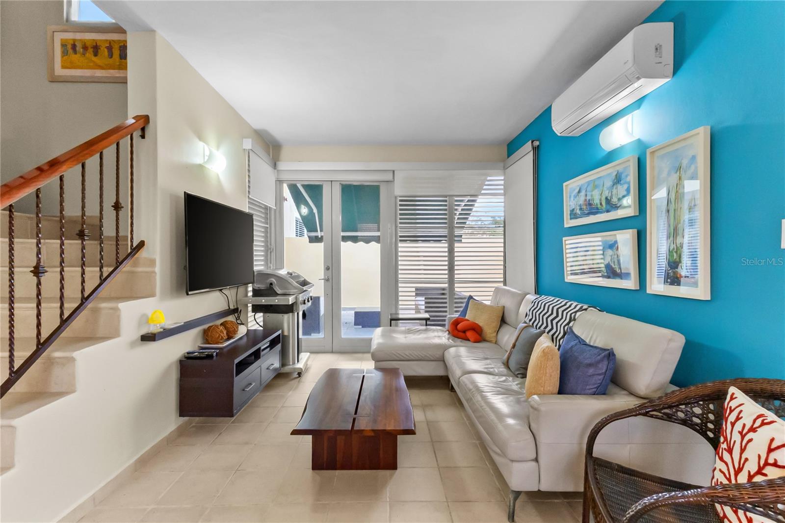 The first floor features two bedrooms and two full bathrooms, a convenient laundry closet, and an open-concept kitchen that flows into the living and dining areas. Step outside to a private patio with retractable awnings, perfect for relaxing or entertaining.