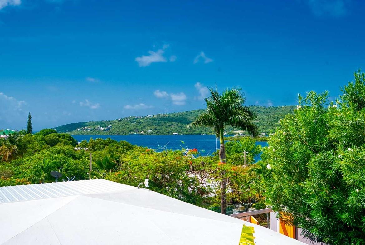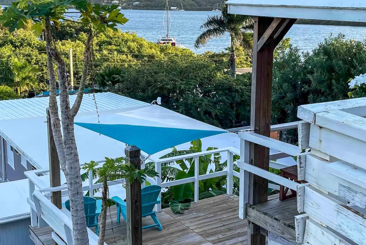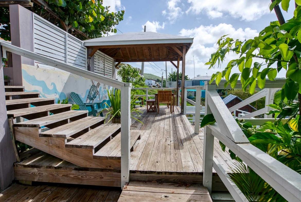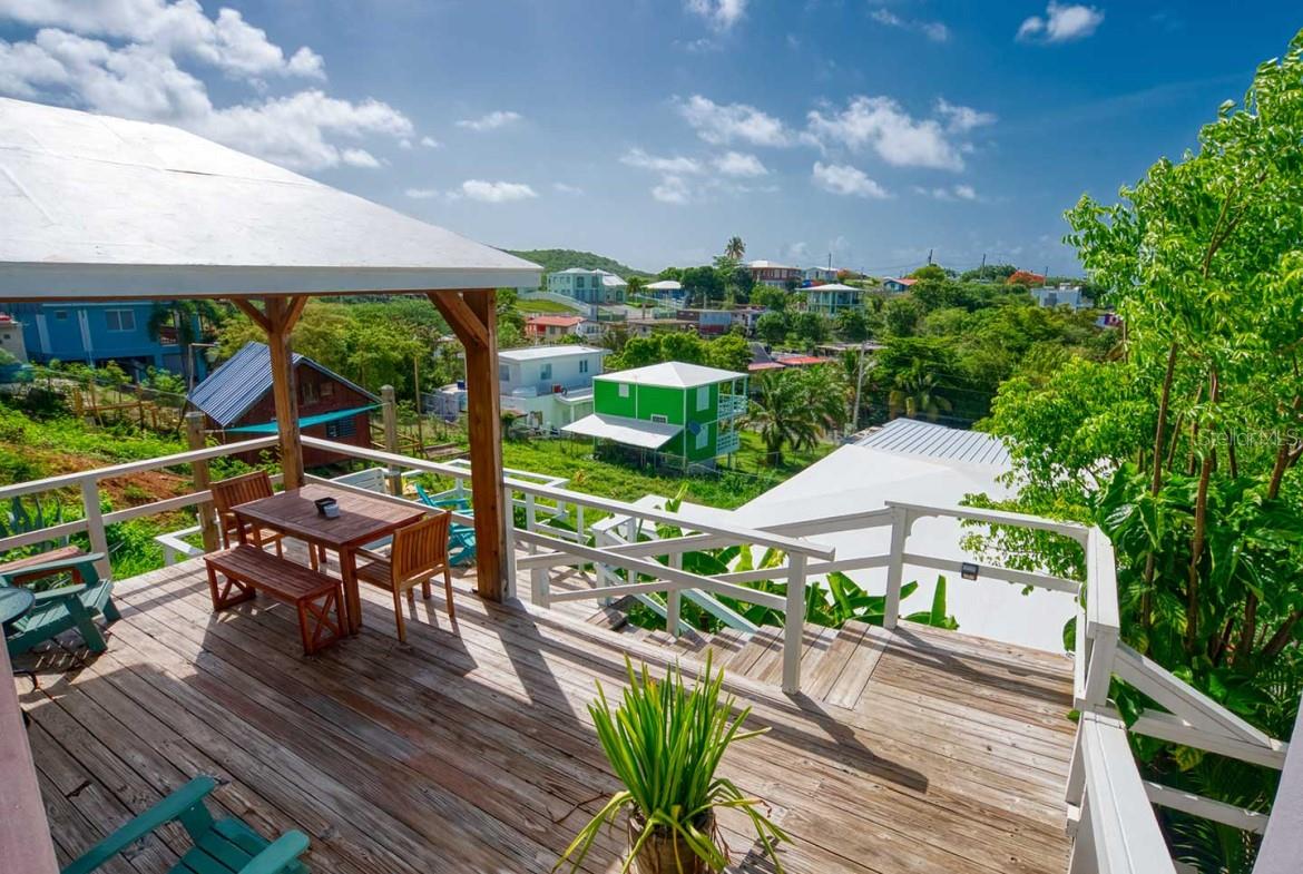As you enter Seagrapes Guesthouse from the street level, you walk through the gate and onto a communal covered terrace, with seating, a table, and a view of the bay and the Caribbean sea.   On this level is a baggage storage room and bathroom with a changing area where guests can get ready for their beach day.