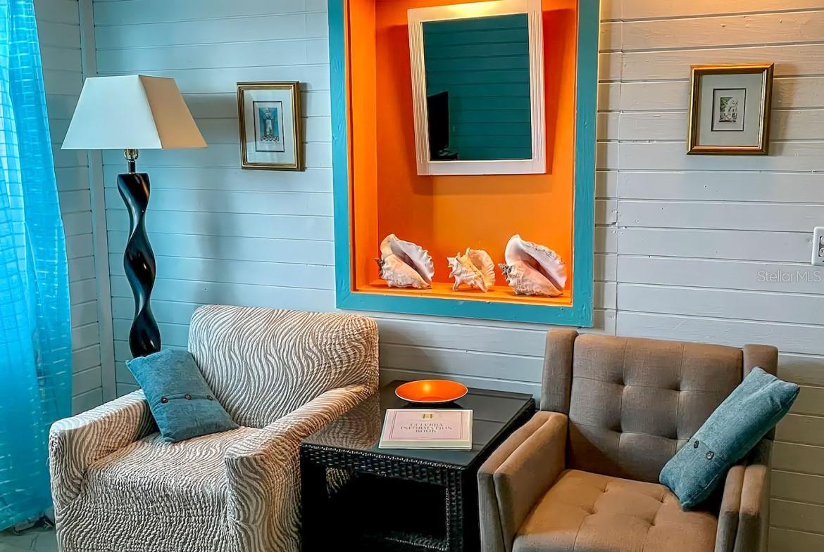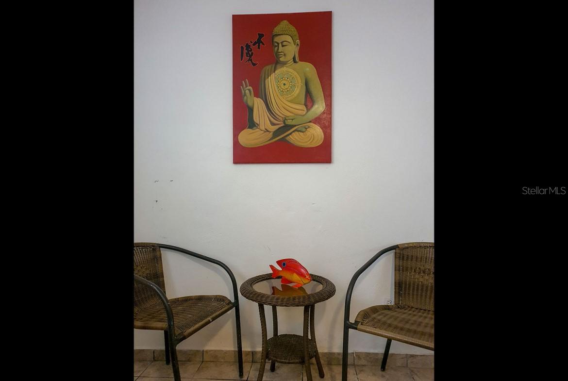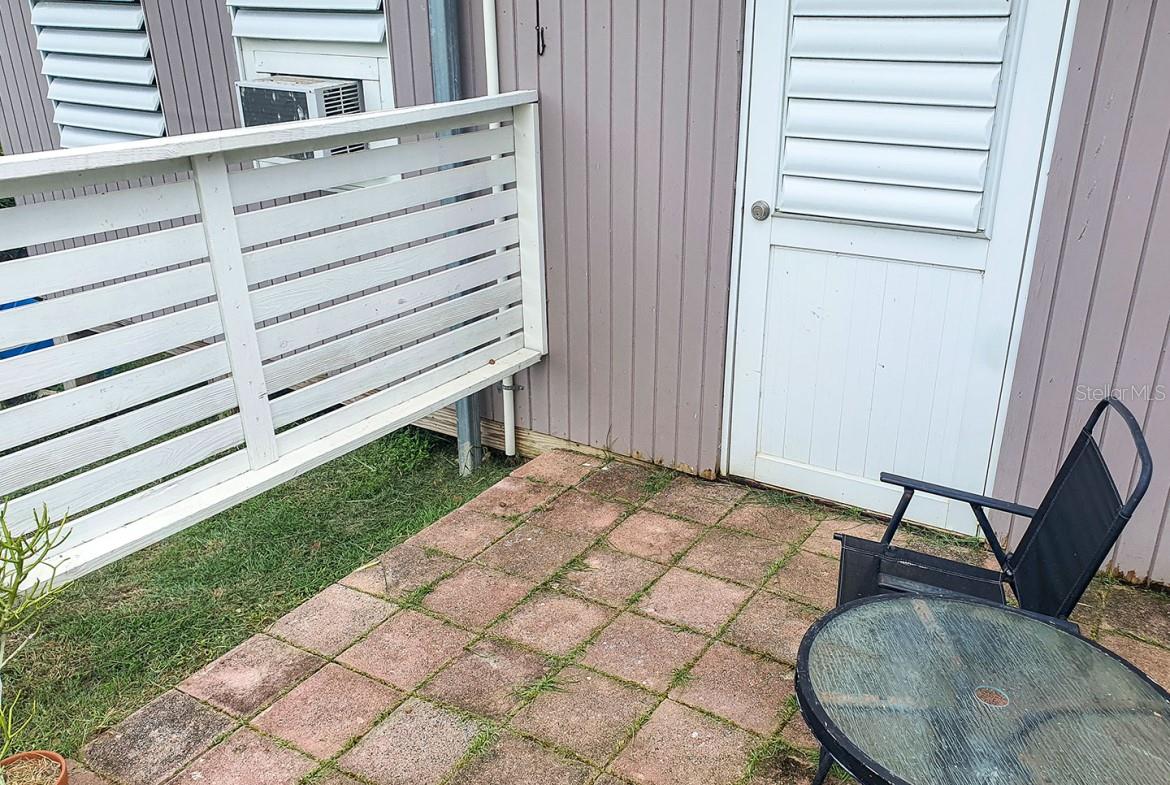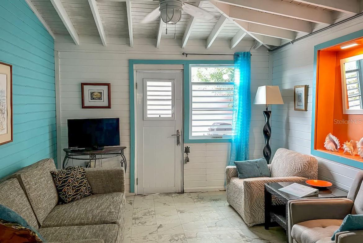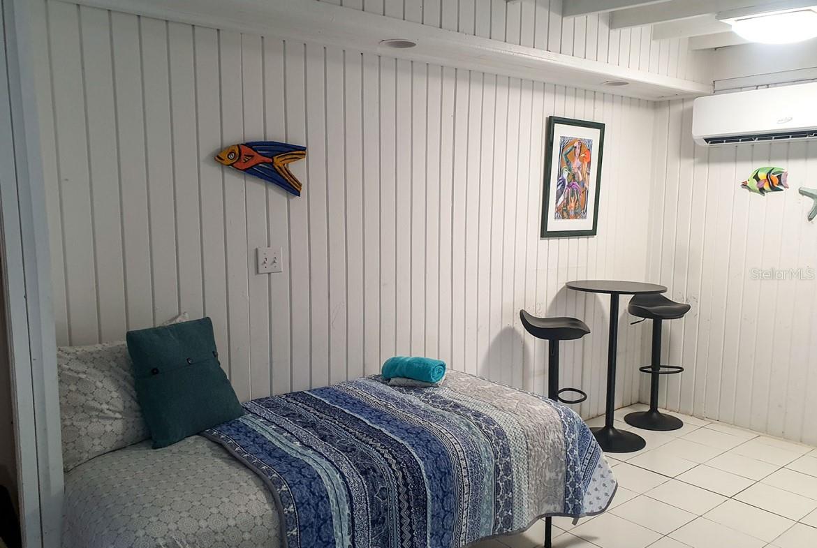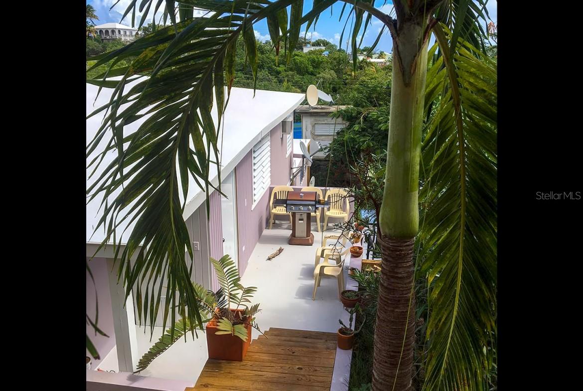 A few steps below is the fourth unit known as the "Villa".  This unit is a cozy one bedroom apartment with custom kitchen, peninsula granite countertop, ample living area, a full bath, and an outdoor seating area. Each apartment has split air conditioning units and are fully furnished and equipped.