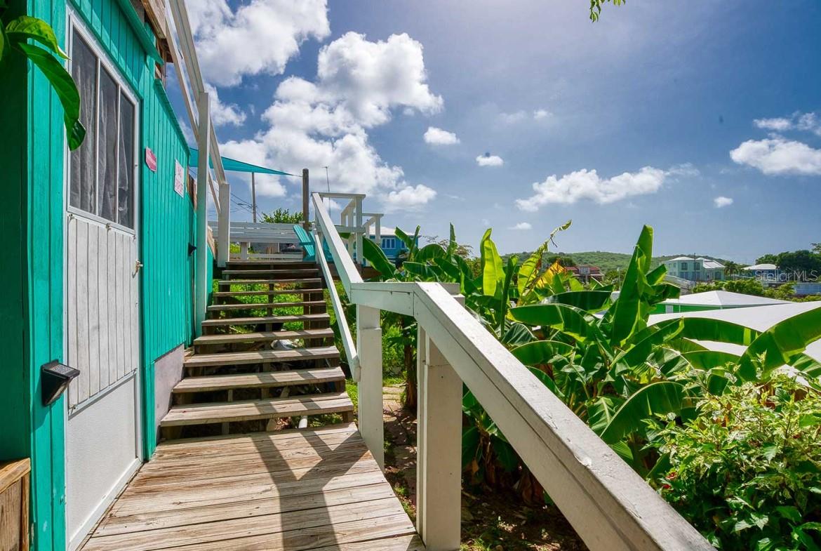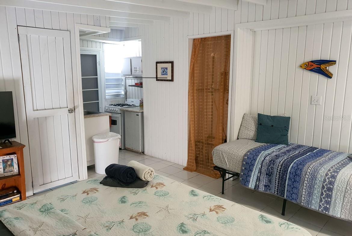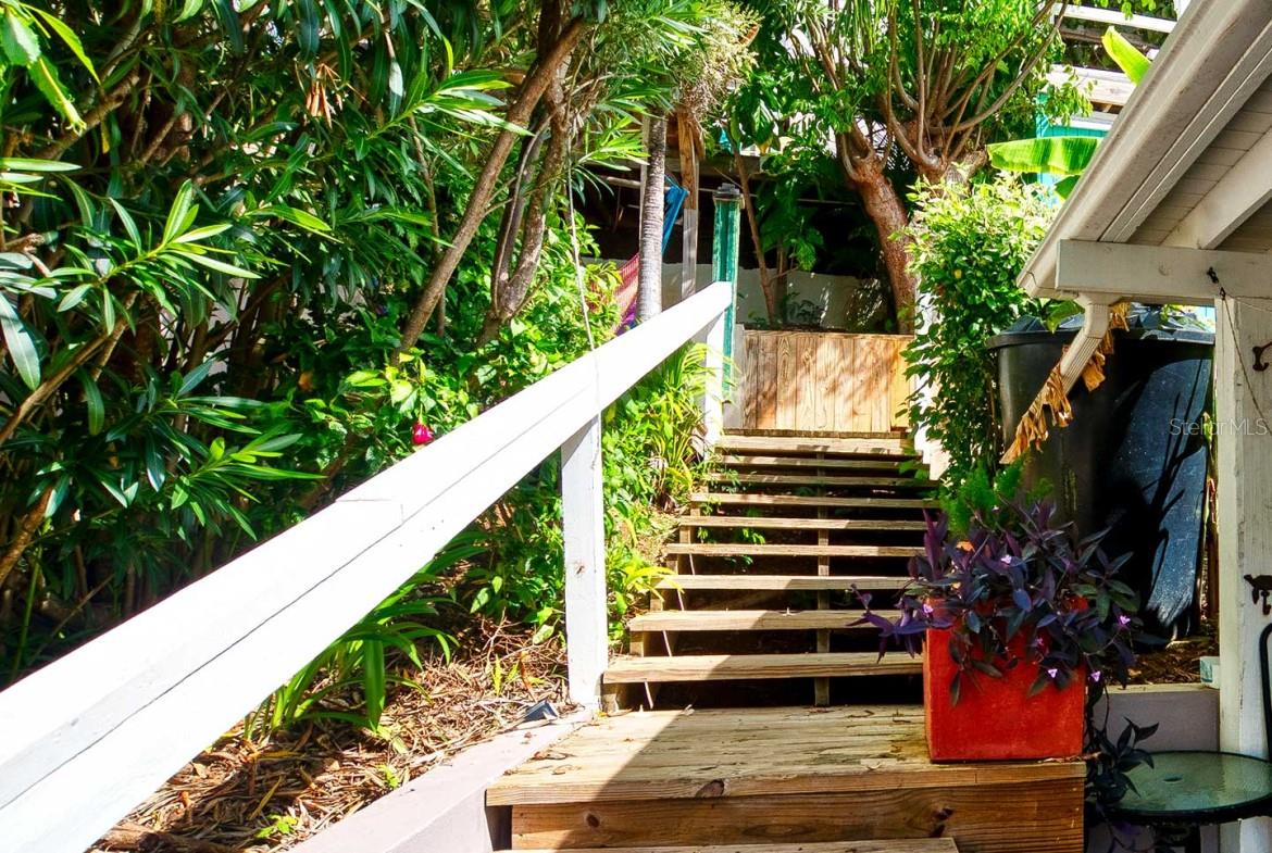 Walking down the steps to the first apartment, you enter a Studio apartment with a king sized bed,  a kitchenette, a full bath, and a back entrance with private outdoor sitting area.
