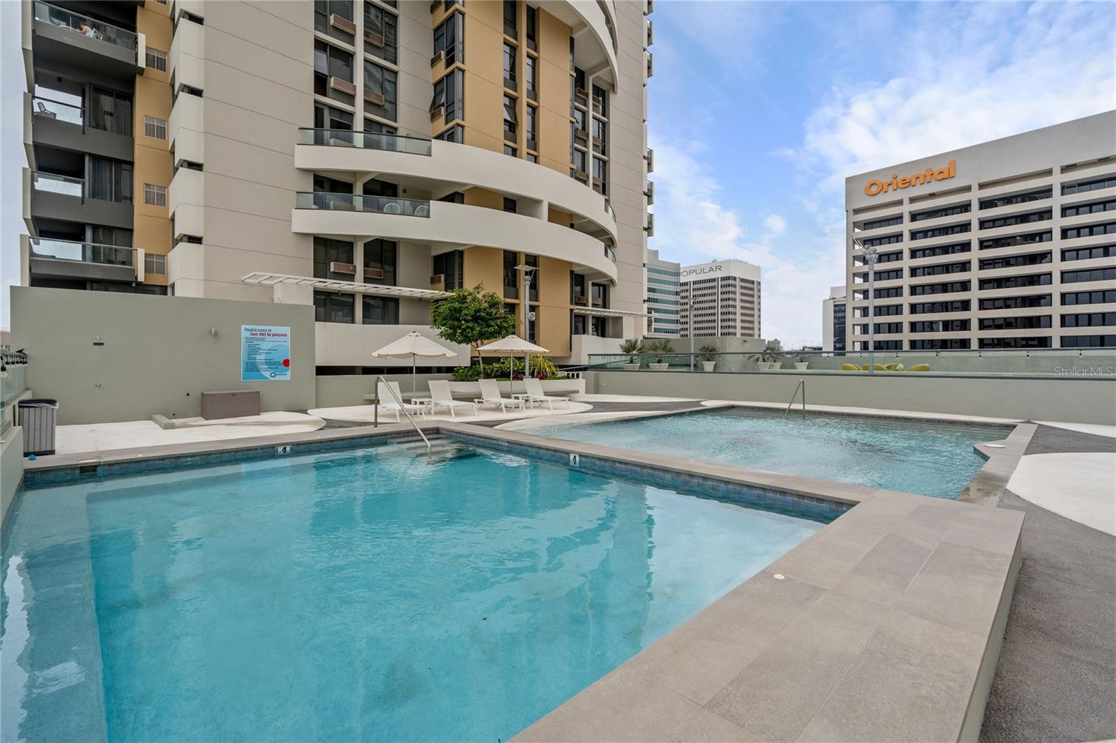 On the 8th floor, residents can enjoy a state-of-the-art pool with a separate whirlpool, an outdoor kitchen, bathroom facilities for private events, an activity room equipped with high-definition televisions, air conditioning, spacious sectional seating, and a pool table. The building also features a gym with state-of-the-art equipment and a movie theater in the lobby, complete with reclining seats for private activities.