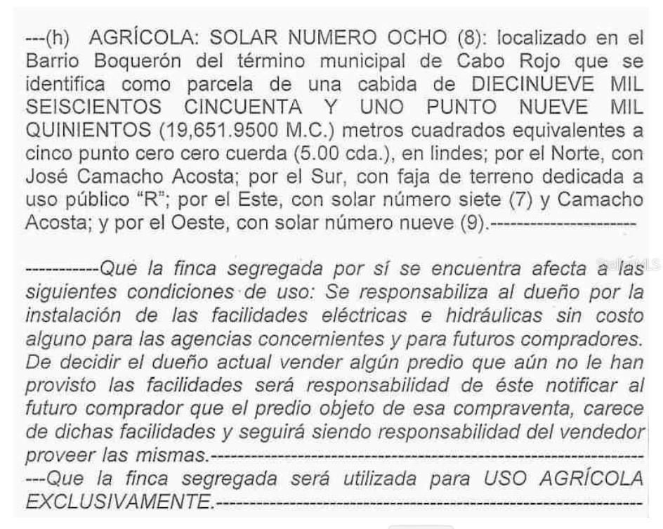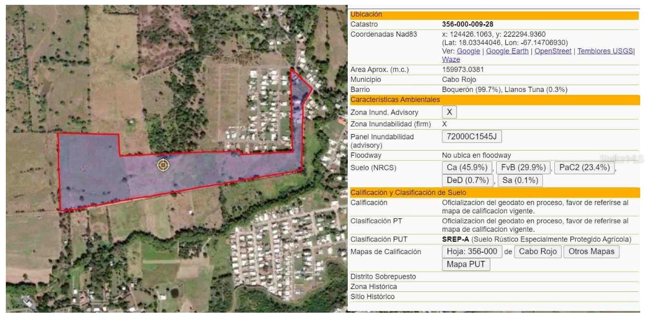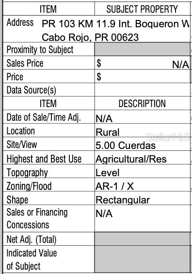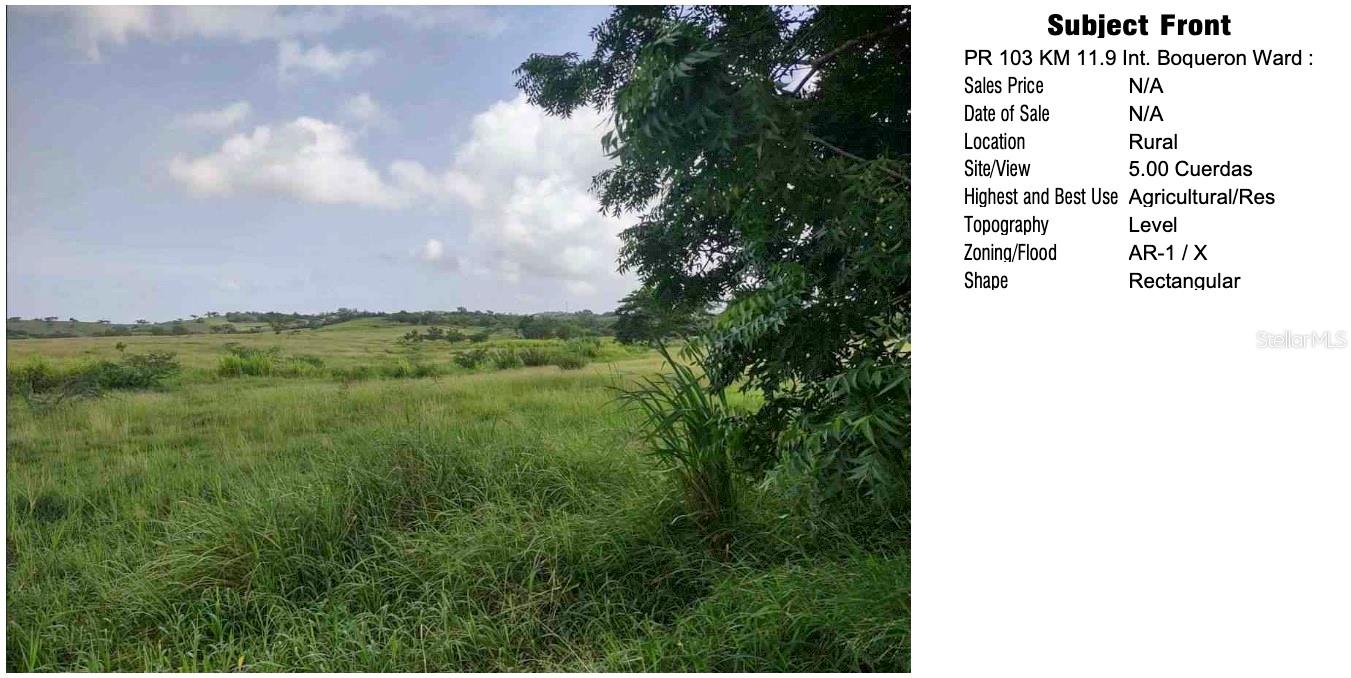Utilities: The property is positioned for utility access, including electricity via LUMA Energy and water through AAA, though connections are not yet established. Environmental and Market Considerations: The lot is situated outside FEMA-designated flood zones (Zone X) and is free of known adverse environmental factors. The appraisal considers recent comparable land sales in nearby rural areas, with values adjusted based on size, zoning, and market demand. The most comparable recent sales suggest a market value of approximately $53,000 each acre (cuerda), totaling an estimated property value of $265,000 as of October 7, 2023./ Marketability: Given its strategic location and zoning, the property is well-suited for agricultural development or residential projects that align with the rural zoning restrictions. The appraisal notes a marketing time of over six months, appropriate for rural land in this market, and the demand is expected to be stable, aligning with similar properties in Cabo Rojo./ Final Note : This property offers a unique investment opportunity within Cabo Rojo's desirable Boquerón Ward, combining rural charm with convenient access to urban amenities. Its zoning and location present a rare chance to secure a large, versatile lot in an agriculturally reserved area, ideal for buyers prioritizing land preservation and strategic investment potential.