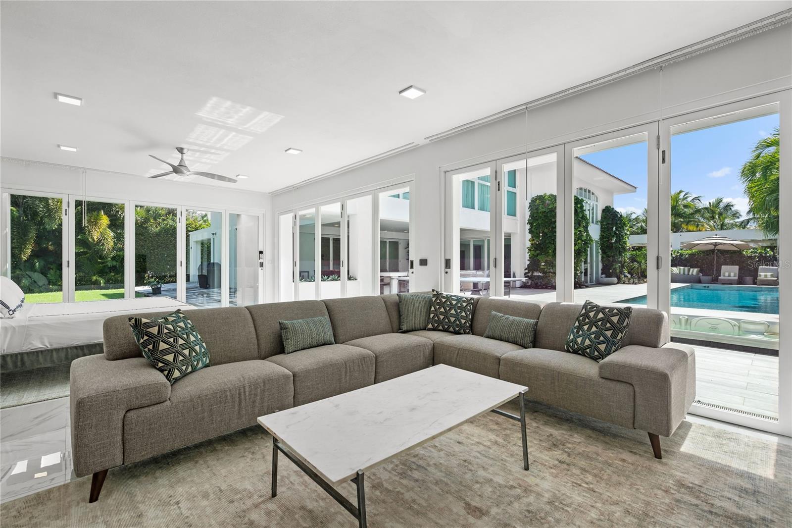 On the second level, the primary suite is a true sanctuary, boasting his and hers walk-in closets, a private office, and a spa-inspired bathroom. Three additional ensuite bedrooms provide ample space for family or guests.