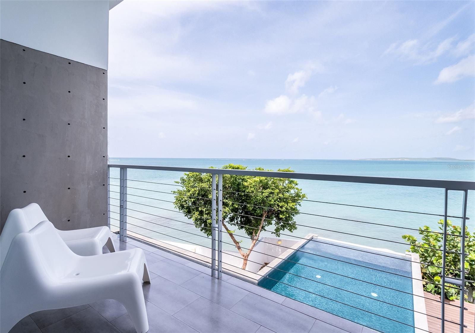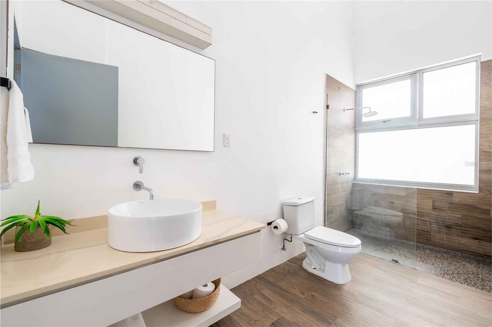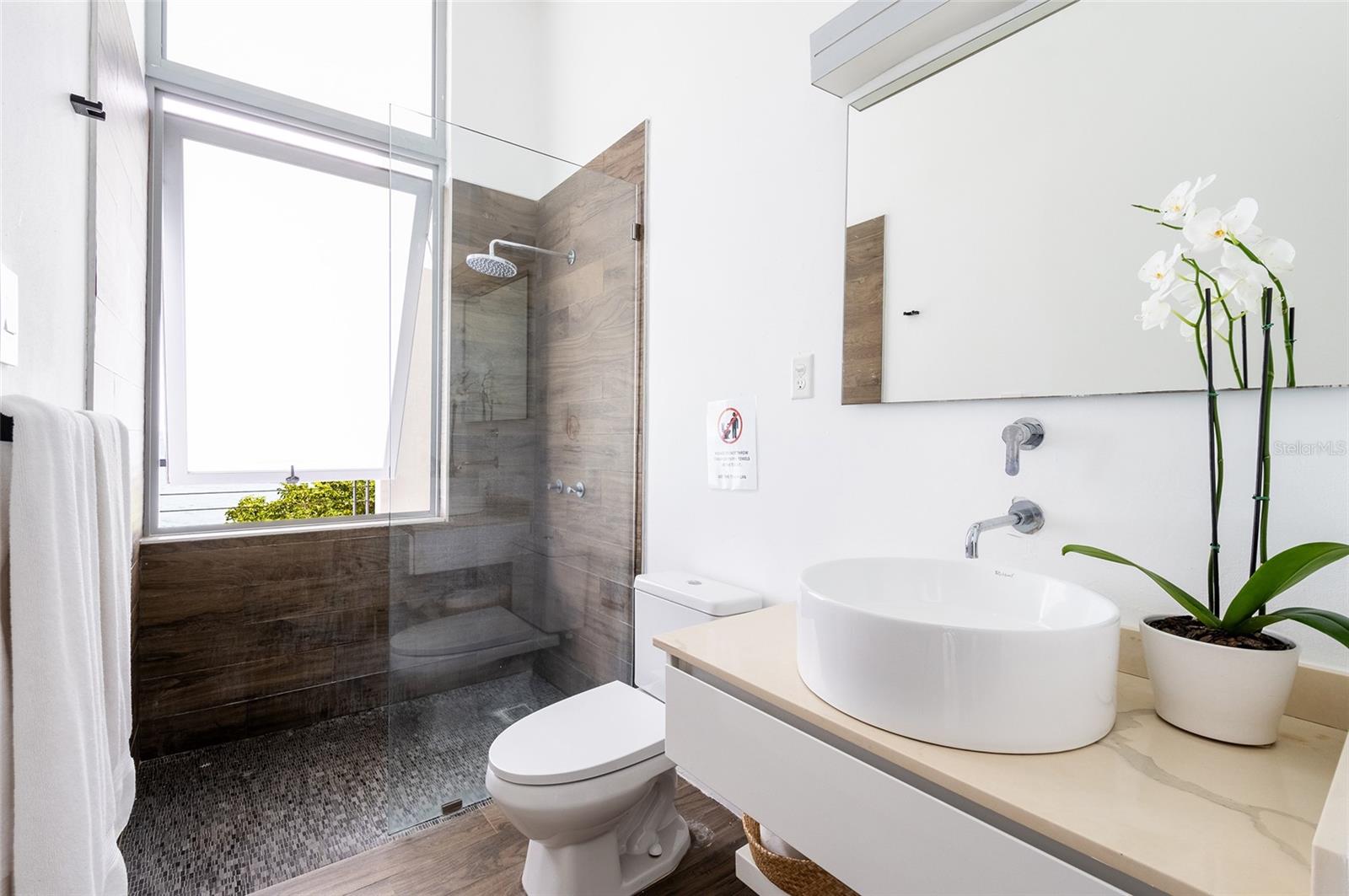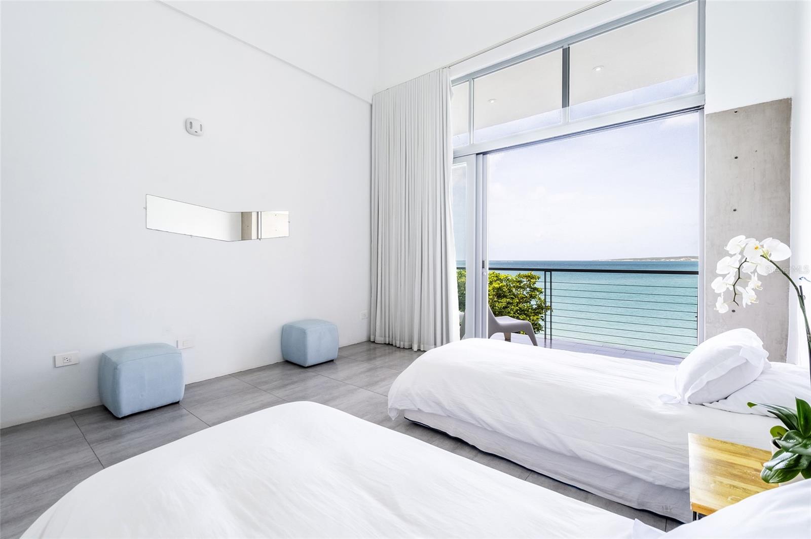 The master suite is a serene sanctuary featuring panoramic views of the Caribbean Sea. The spa-like master bathroom is a retreat in itself, with dual vanities and a walk-in shower. Four additional bedrooms are thoughtfully designed to offer guests comfort and relaxation.