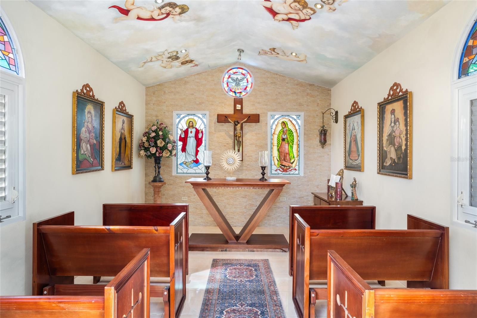 The property's exterior features beautiful gardens that lead to a private and relaxing area, where a pool house and pool provides additional space for entertaining or relaxation. Additionally, a chapel with seating for twelve adds a unique and special touch to this rural estate.
