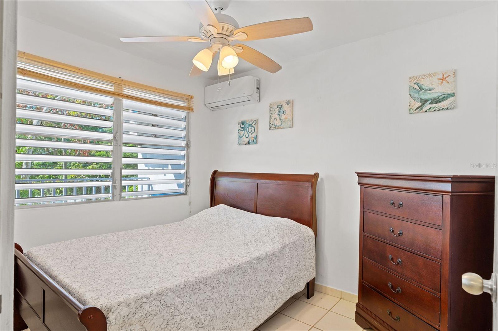Both bedrooms are well-appointed, with mirrored closets, air conditioning units, and ceiling fans for ultimate comfort. The bathroom is modern, with a walk-in shower and sleek fixtures.