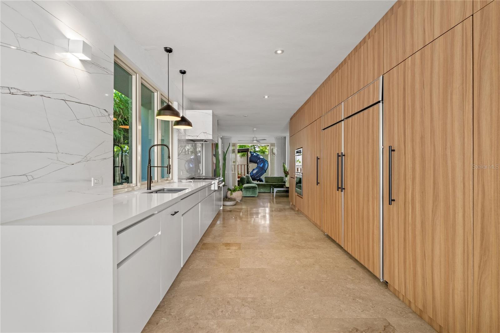 The chef’s kitchen is appointed with GE Monogram appliances, a gas range with a commercial-grade exhaust system, quartz countertops, and a striking marble backsplash. An adjacent wet bar with Monogram beverage refrigerator ensures effortless entertaining. Step outside to a serene private oasis, complete with a tranquil pool, red palm trees, black bamboo, and a thoughtfully designed herb and frangipane garden. Custom louvered wood features, including doors and an outdoor shower, transform the space into a true retreat.
