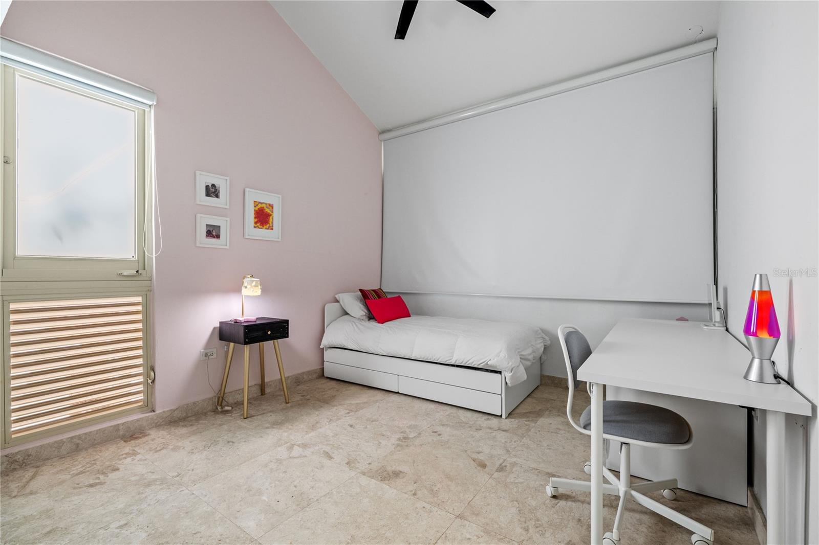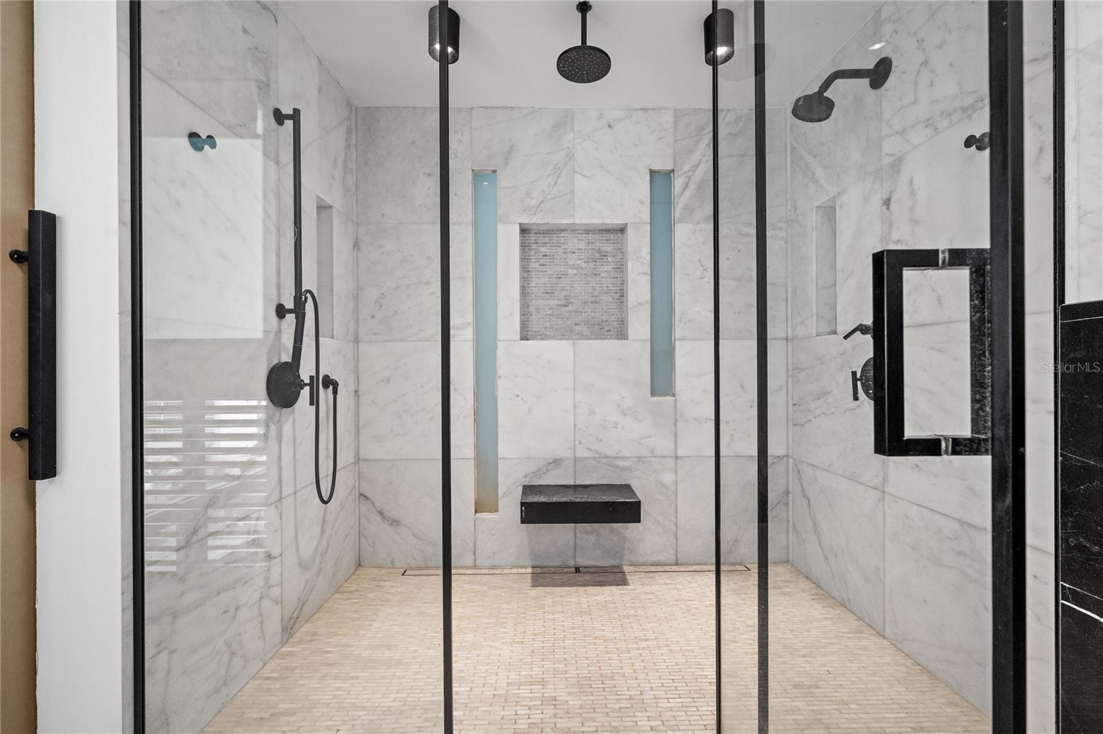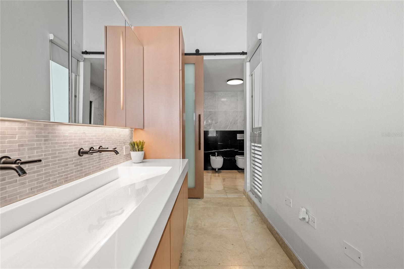 Upstairs, a guest suite with a 400-square-foot private terrace and spa-inspired bathroom—featuring an open-air shower experience—provides a peaceful sanctuary. The primary suite boasts vaulted 16-foot ceilings, a marble shower, Roca toilets, and Kohler fixtures. Three additional guest bedrooms are served by a full bath with a soaking tub.