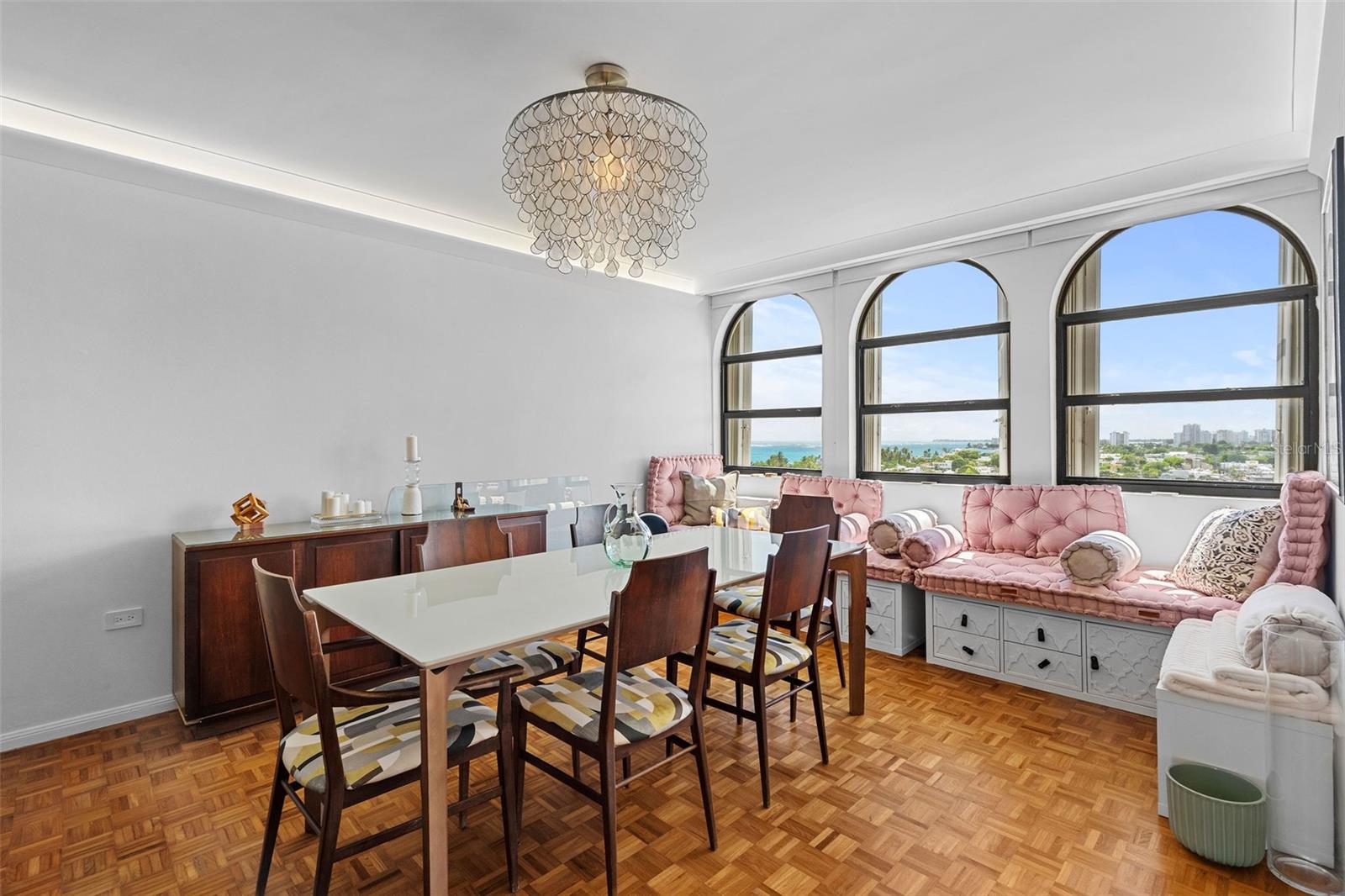 The spacious interior showcases arched windows and original teak parquet floors. Each bedroom has an en-suite bathroom, and the master suite features a walk-in closet. A convenient half-bath serves the living area.