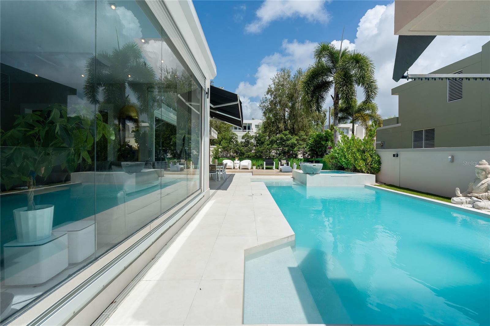 The property also features an exclusive living room with an integrated bar and stools, perfect for sharing with family or friends while enjoying the beautiful view of the pool and terrace. The glass walls allow natural light to flood the space, creating a peaceful and harmonious atmosphere.