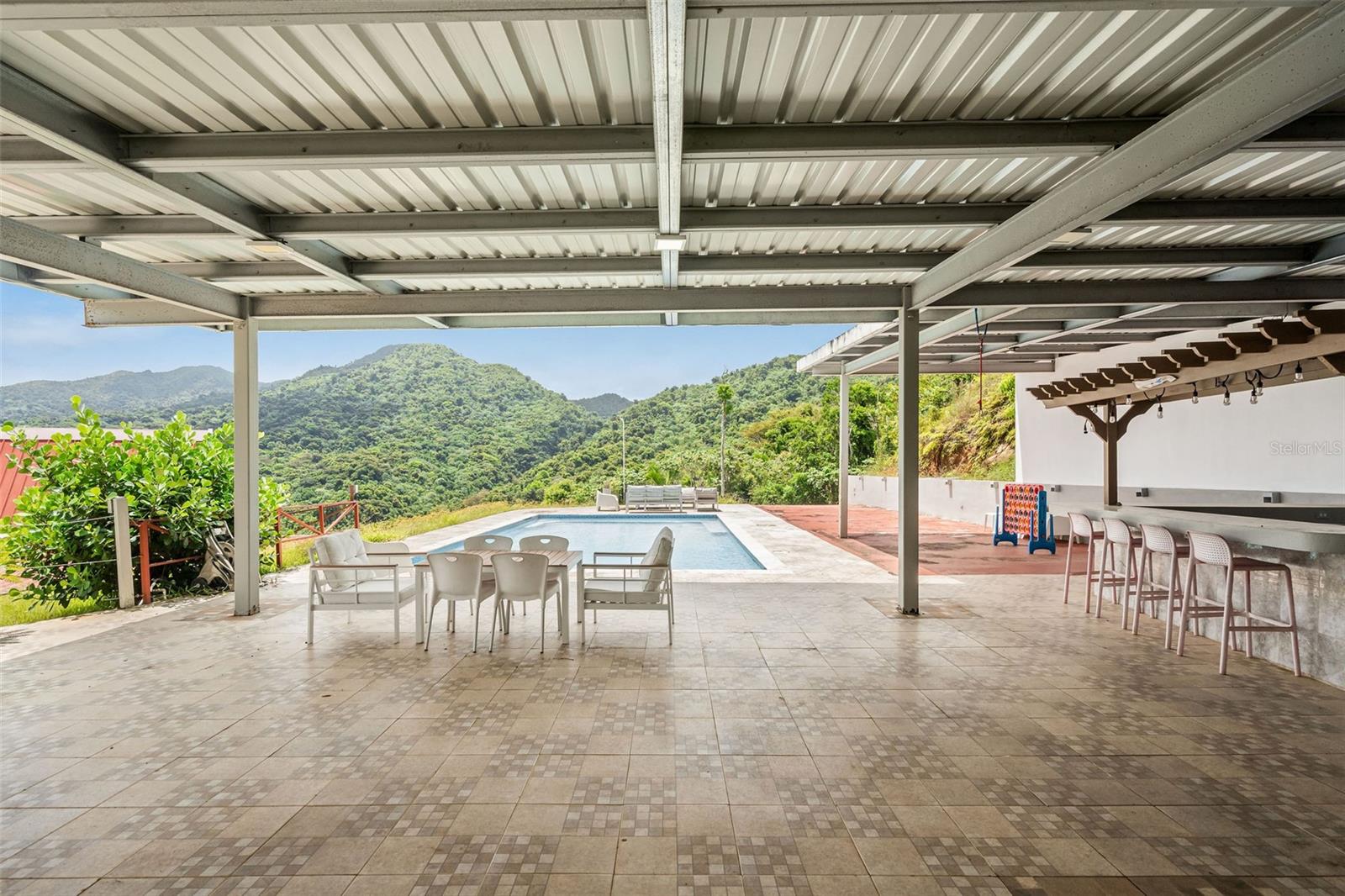 Outside, you'll find a spacious terrace equipped with a kitchen, refrigerators, and a built-in bar area, perfect for entertaining friends or family. There's also a large pool and plenty of outdoor space to enjoy.
