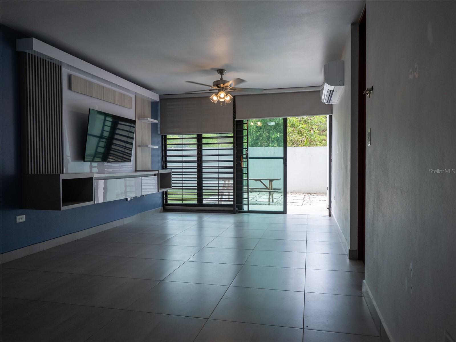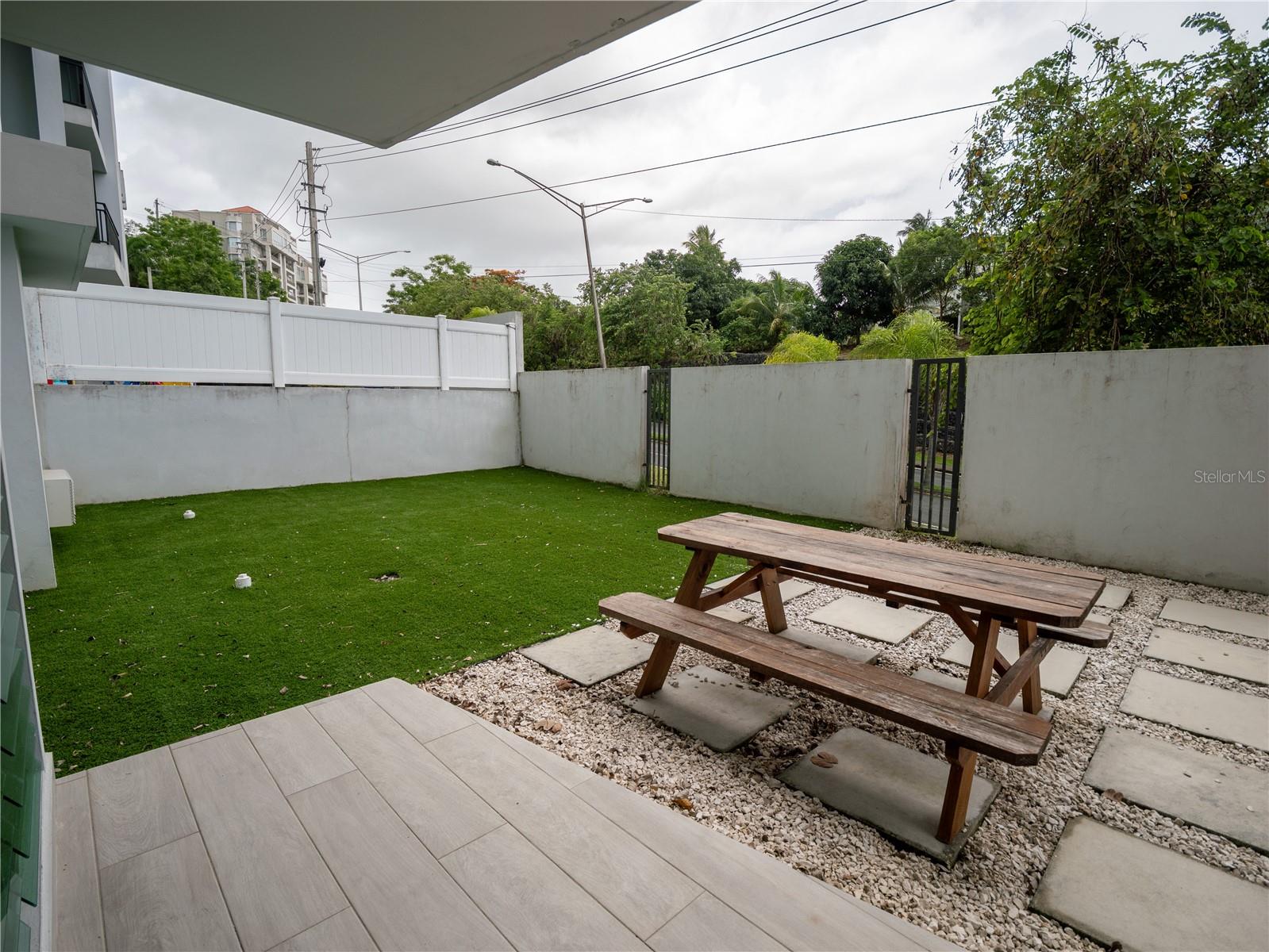 Modern garden-level apartment featuring 3 bedrooms and 2 bathrooms, with living room, dining area, laundry area, terrace, and a patio with artificial grass.