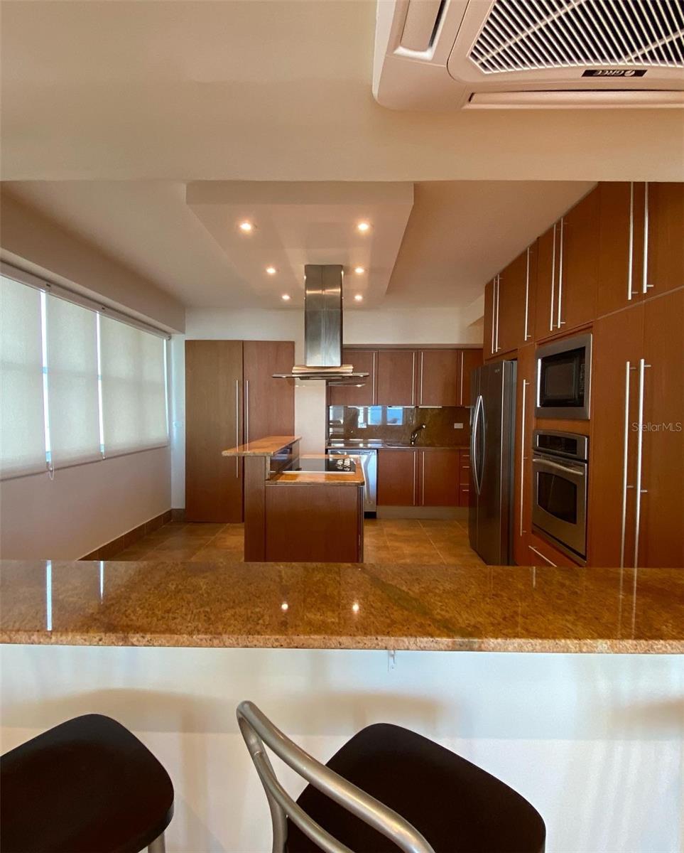 The open kitchen is designed for both style and convenience, with granite countertops, a cooking island, breakfast bar, and stainless steel appliances. A bright living area with an office nook extends seamlessly to a private terrace showcasing both city and ocean views.