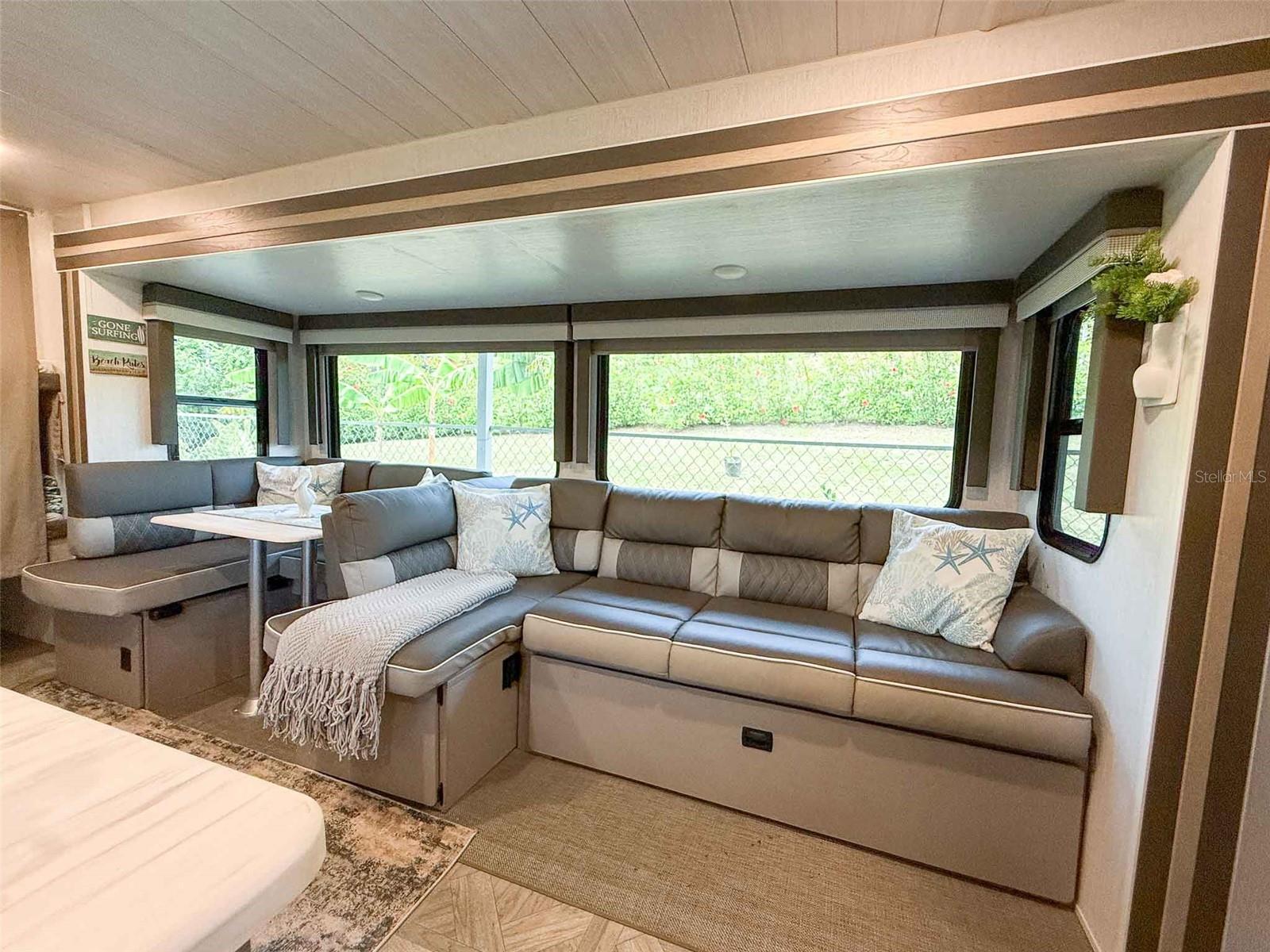 The primary structure is a Forest River Salem Platinum RV (26DBUD floorplan) permanently installed on a concrete pad and protected by a custom-built metal roof. Inside, the RV features a queen-size primary bedroom with built-in closets, a cozy lounge area with decorative fireplace and TV, a full kitchen, dining space, bunk beds, and a full bathroom. Large windows throughout bring in natural light and frame the surrounding tropical landscape. The RV is fully air-conditioned and comfortably sleeps up to six.