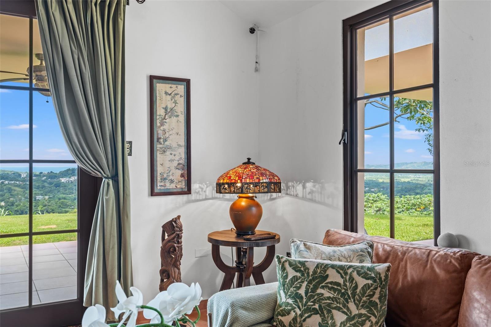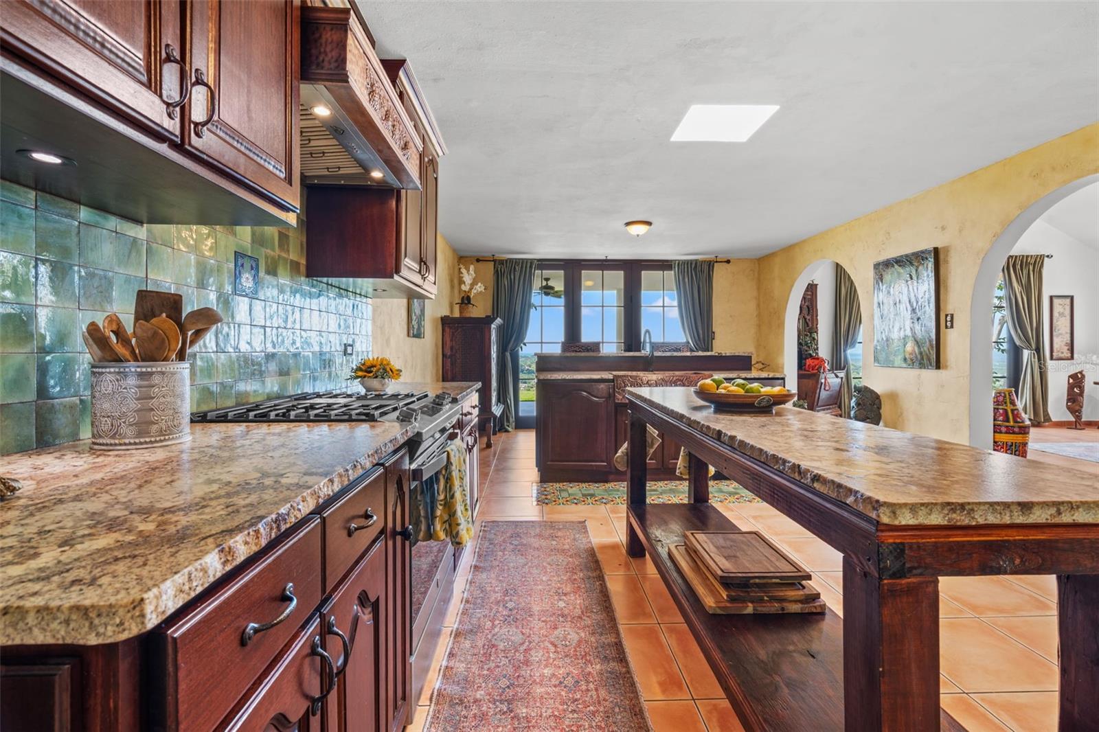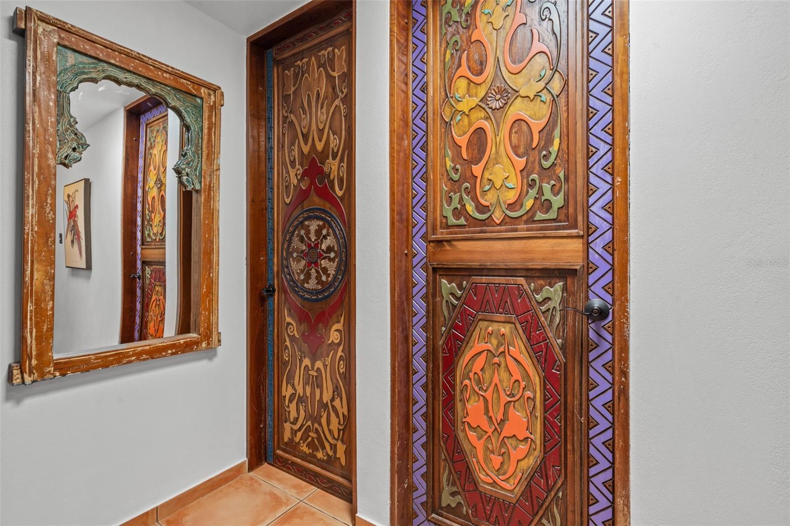 The residence presents 4 bedrooms and 2.5 bathrooms across approximately 3,000 sq ft of thoughtfully curated living space. Impressive high double-pitch ceilings and a flooding peaceful atmosphere greet you as you enter the great room. Every piece of this Mediterranean estate has its own history, with unique adornments from all over the world that create a tasteful ambiance of art and elegance. Handmade accents include wooden handcarved interior doors from Turkey, refined decor from Indonesia, Thailand and India, an exquisite dining and buffet set from Peru and fine furniture from all around the world.