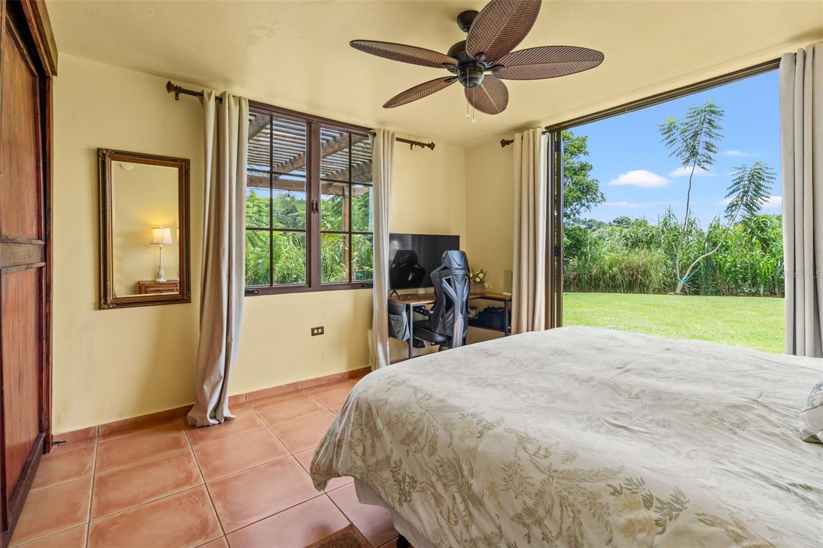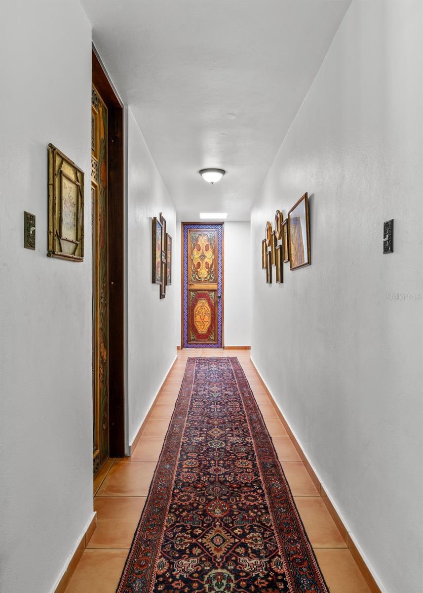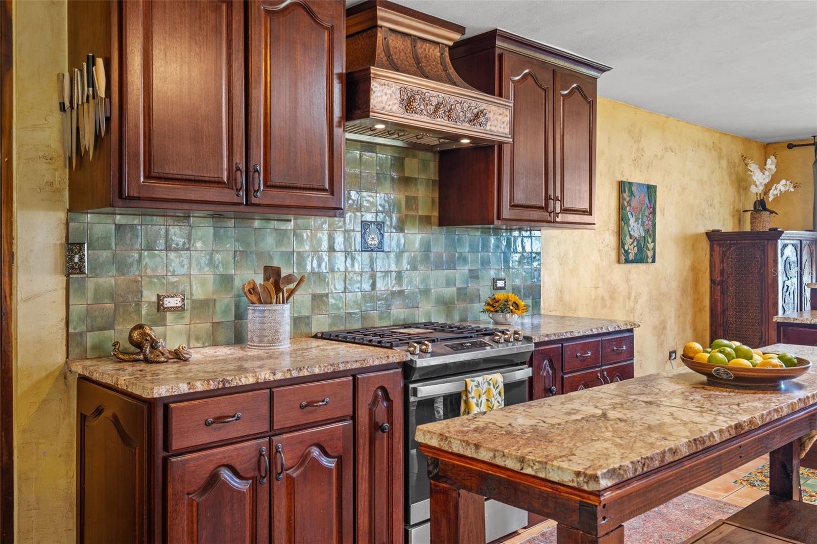 The residence presents 4 bedrooms and 2.5 bathrooms across approximately 3,000 sq ft of thoughtfully curated living space. Impressive high double-pitch ceilings and a flooding peaceful atmosphere greet you as you enter the great room. Every piece of this Mediterranean estate has its own history, with unique adornments from all over the world that create a tasteful ambiance of art and elegance. Handmade accents include wooden handcarved interior doors from Turkey, refined decor from Indonesia, Thailand and India, an exquisite dining and buffet set from Peru and fine furniture from all around the world.