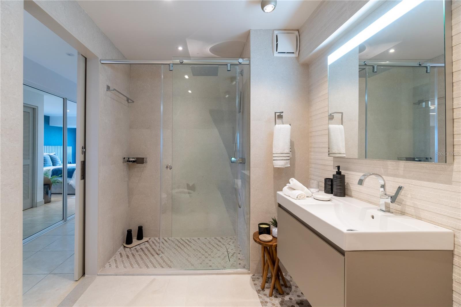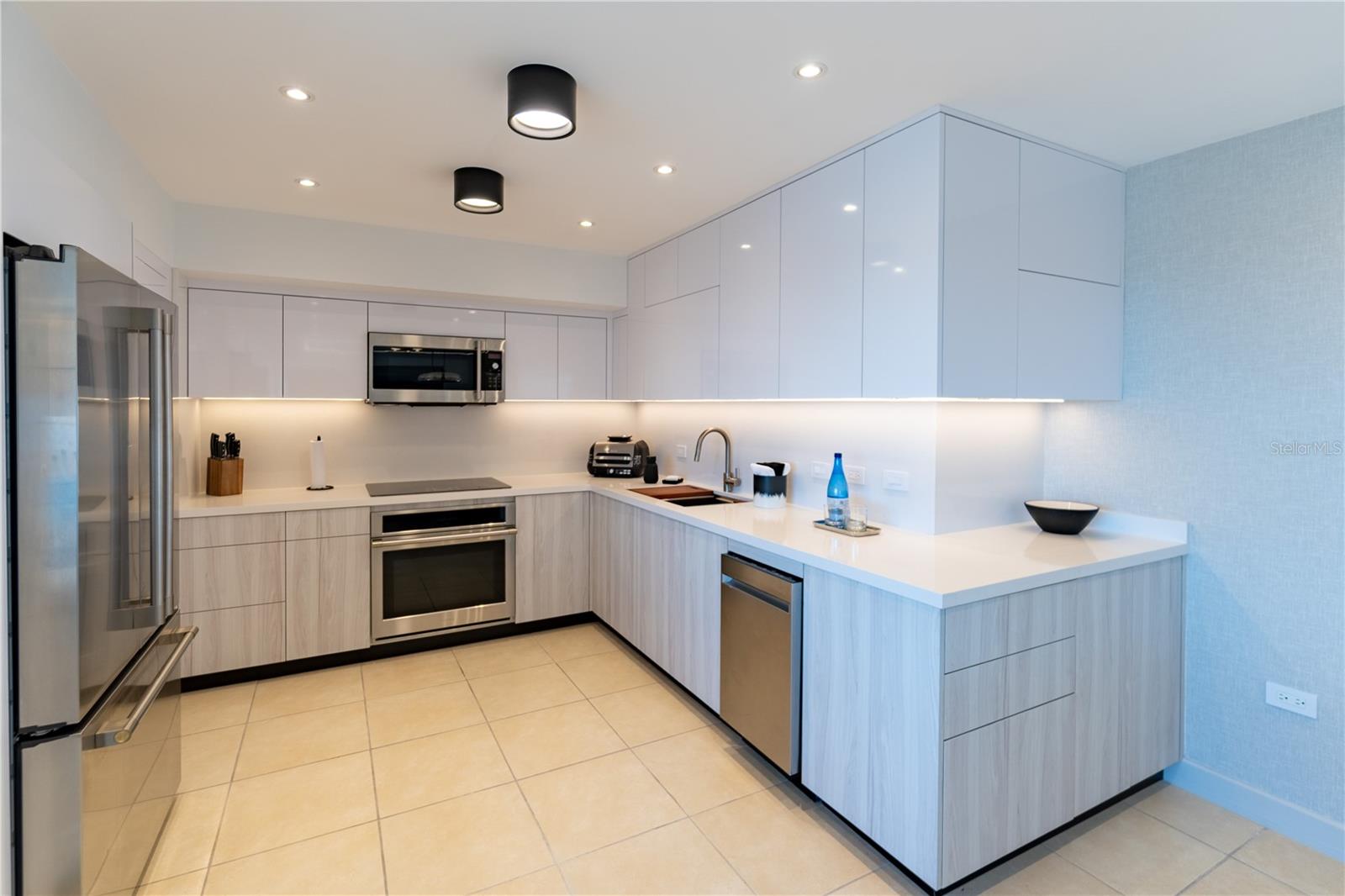 The thoughtfully designed layout features two spacious bedrooms, each with modern en-suite bathrooms and a walk-in closet, plus a convenient laundry room. The interior is completely remodeled, tastefully styled with modern décor, and comes fully furnished with all new furniture, appliances, and a stylish coffee bar station — move-in ready from day one.