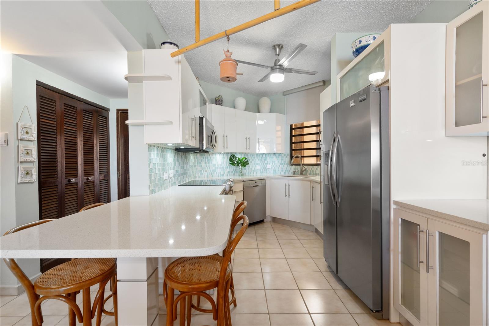 This sought-after turn-key beach residence has two-suites with two-ensuite bathrooms. It is one of the most acclaimed at Crescent Beach in Palmas del Mar Resort due to its location and the beach-facing terrace. It is fully equipped; it is from where you can experience the stunning views of Vieques Island and also located in front of the enjoyable pools. The modern kitchen and dining-living rooms experiences certainly give the residence the harmony and the coziness of a beach home. The primary bedroom is strategically located and has a conveniently renovated bathroom with a modern-open shower and ample walking closet.