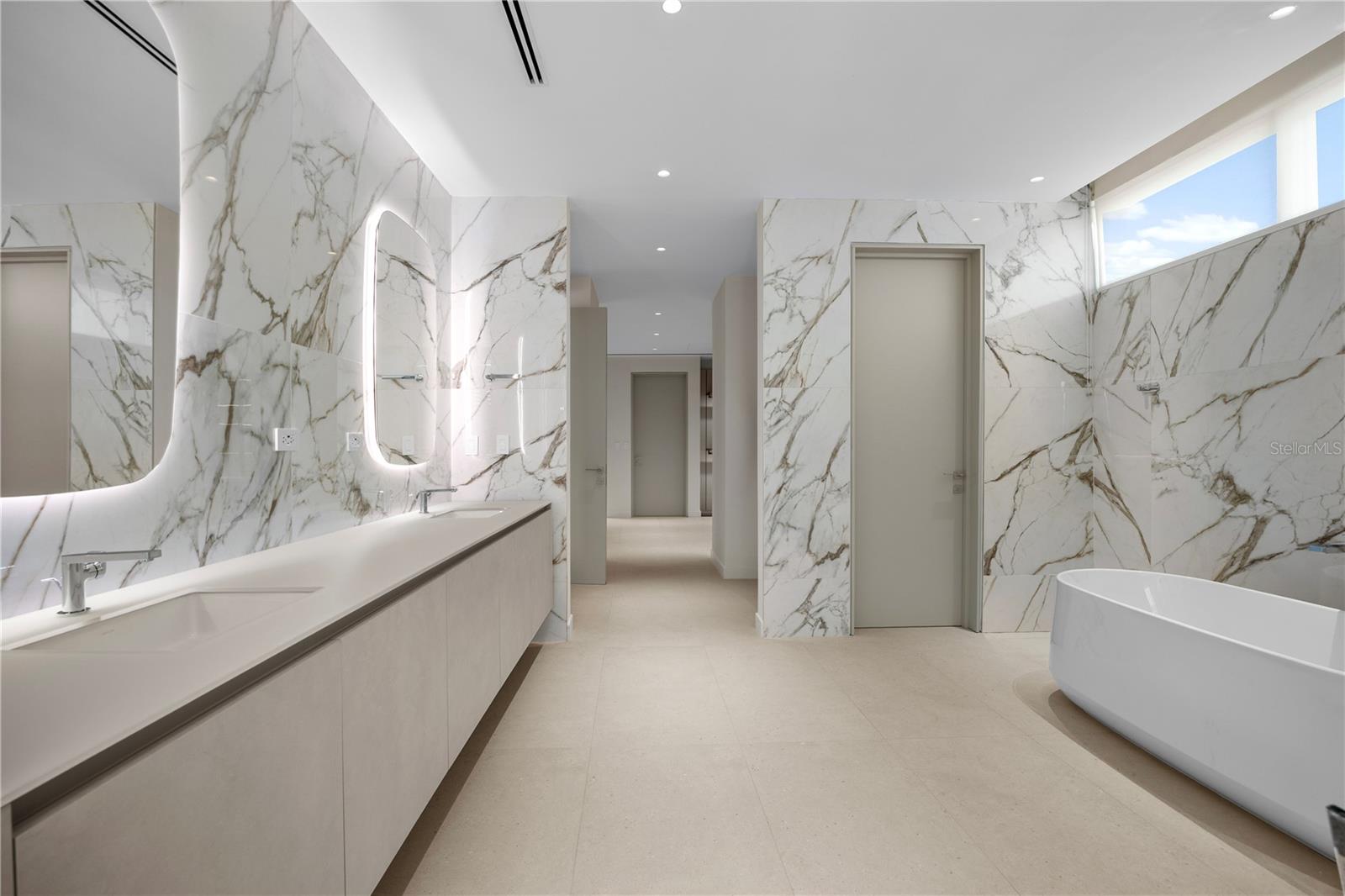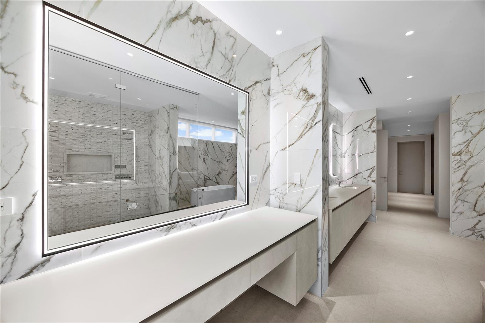 The exterior is equally remarkable, boasting spacious terraces, lush gardens with professional irrigation and lighting, a resort-style swimming pool and a versatile jacuzzi that can be enjoyed heated for relaxation or as a refreshing cold plunge bath. A three car garage plus golf cart space complements an incredible 4,900 sq. ft. (approx.) paver driveway, offering a spectacular entrance and abundant parking.