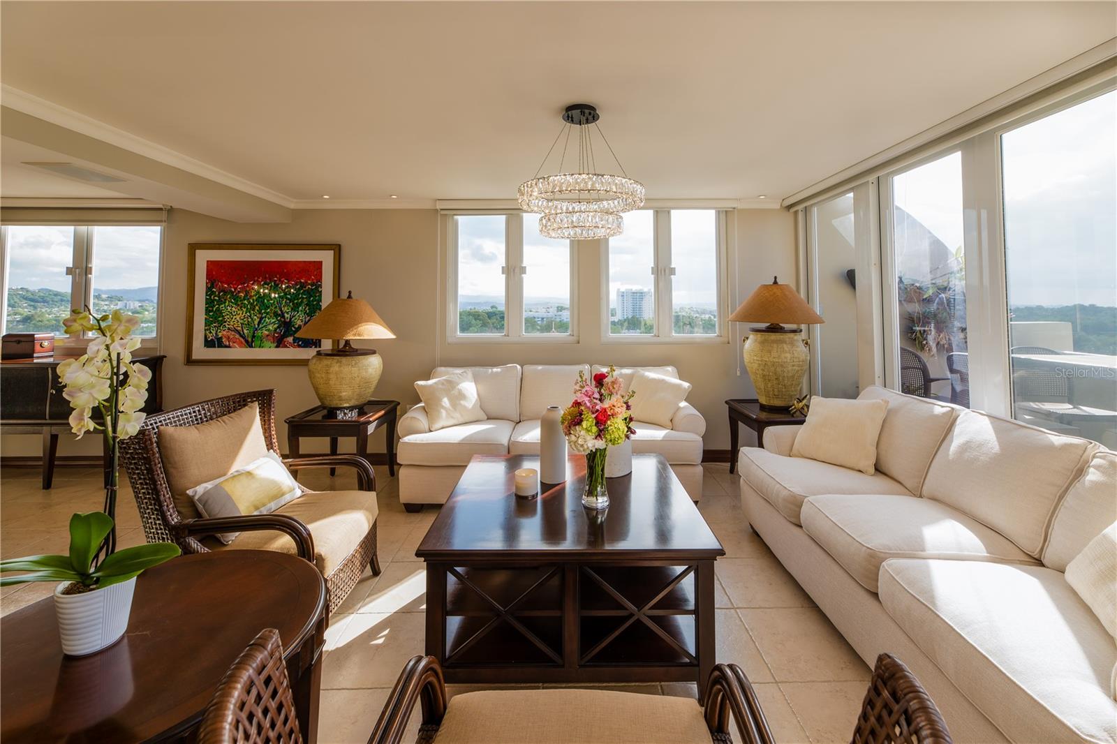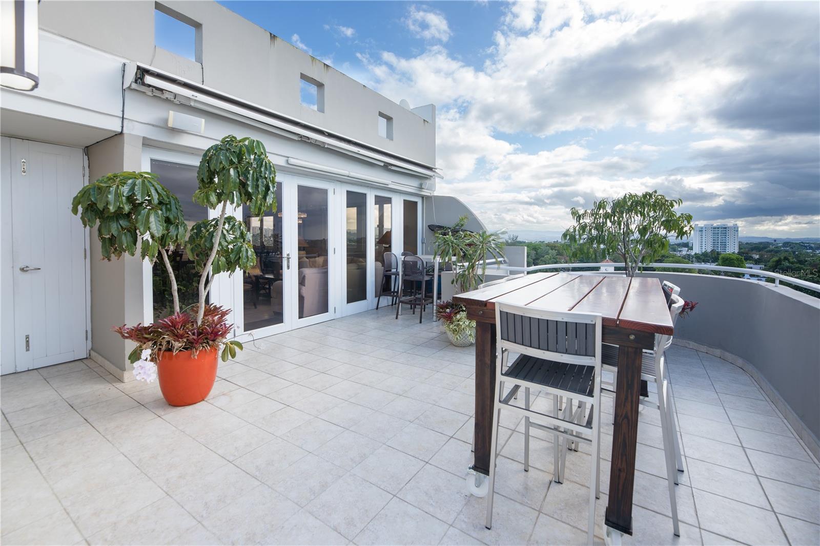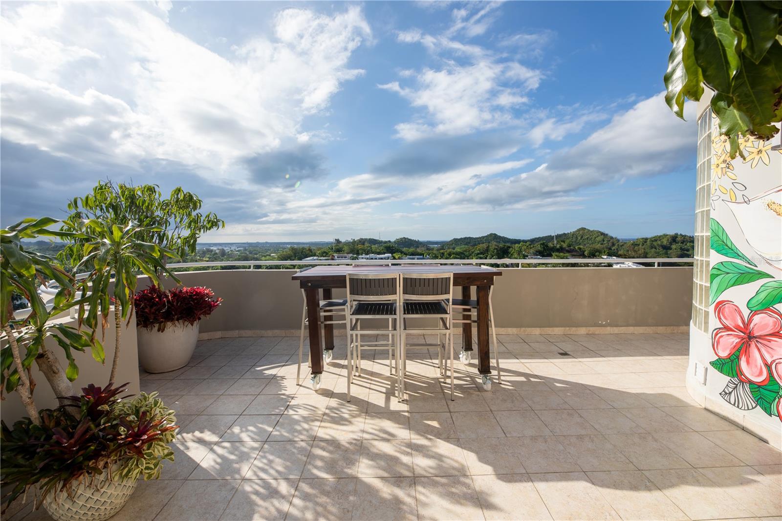 Beautiful, fully furnished and equipped penthouse apartment featuring 2,145 SF of interior space and a 540 SF terrace facing PR-2, with panoramic views of San Juan, Cataño, Guaynabo, and Bayamón. The apartment includes an entrance foyer, a spacious kitchen, a dining area with an 8-seat table, a family room with sofas and a center table, a living room with a plasma TV, and two generously sized bedrooms—each with its own walk-in closet and full bathroom—as well as a laundry room. Thoughtfully decorated with unique and beautiful artwork, this home is in mint condition. Two covered parking stalls are conveniently located near the entrance to the elevator lobby. Building amenities include a pool, gym, visitor parking, full backup power generator, water cistern, and an air-conditioned lobby. Offered in completely move-in-ready condition with high-end finishes and furniture.