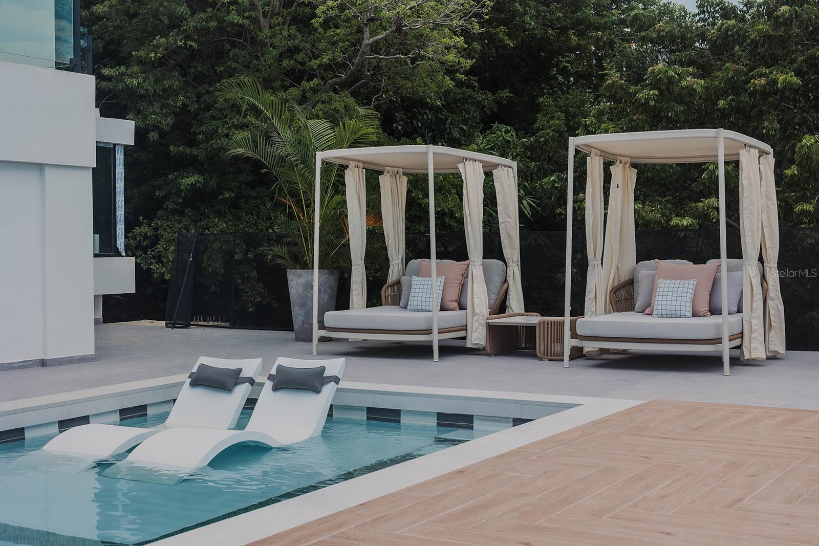 Resort-style pool, spa, lazy river, and swim-up bar
