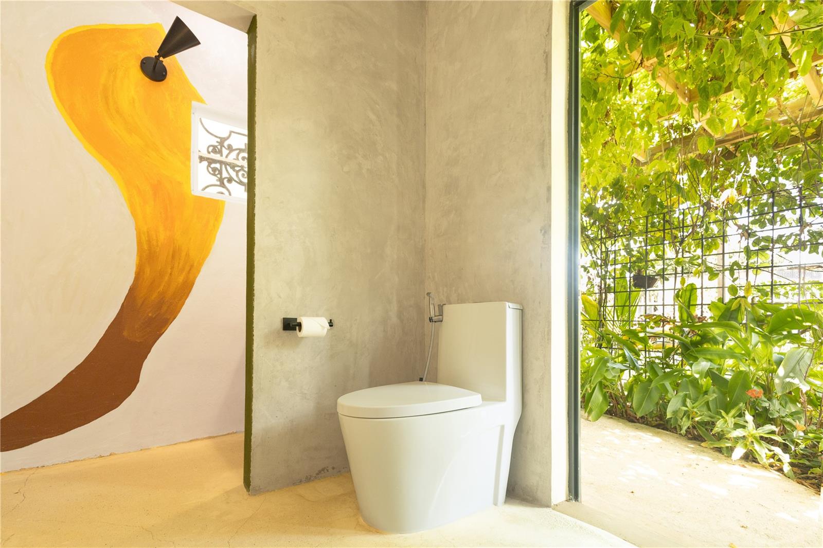 The home features an eclectic mix of design materials—polished cement, warm wood accents, and colorful decorative tiles—creating a vibrant, textured aesthetic that feels both tropical and timeless. The property consists of two separate apartments, offering flexibility for guests or multi-family living.
