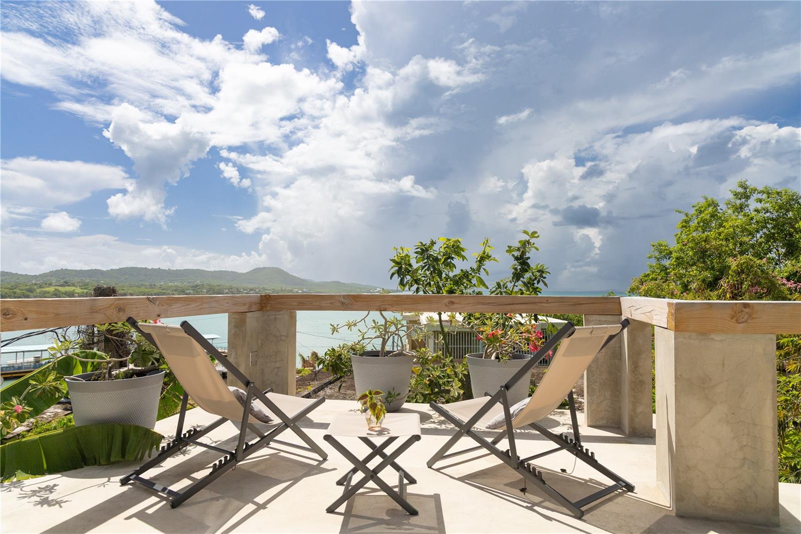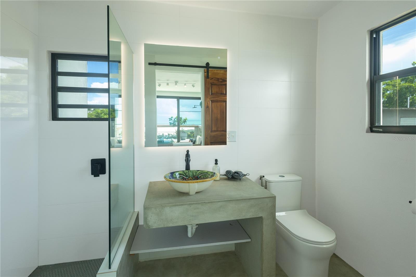 Upstairs, the second apartment feels like a boutique loft. High ceilings, expansive sliding doors, and windows create a breezy, light-filled space that opens onto a massive terrace—perfect for lounging or enjoying the deluxe outdoor shower while taking in panoramic views of the bay. This unit also includes a dedicated workspace, a comfortable living area, and an ensuite bathroom.