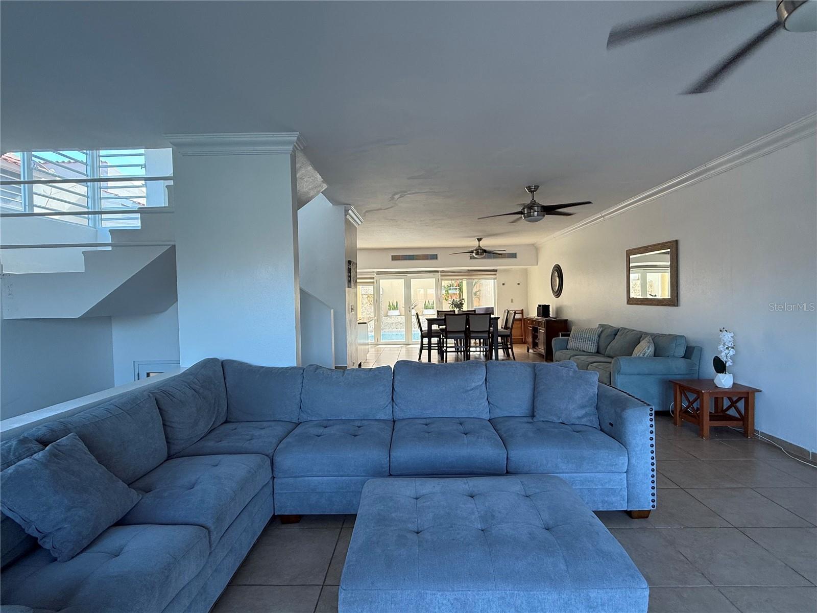 On the second level, the main living quarters open into a bright, open-concept floor plan that seamlessly connects the living room, dining area, and kitchen. Expansive glass doors lead to a balcony overlooking partial views of the beach and the El Yunque mountains, creating a perfect indoor-outdoor flow. This level also includes a half bathroom and access to a beautiful private pool with cascading waterfall—ideal for entertaining and relaxation.