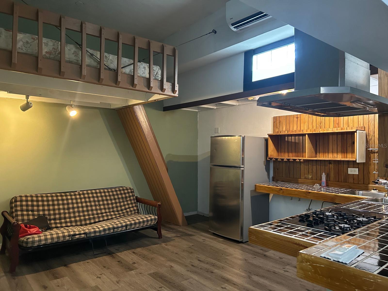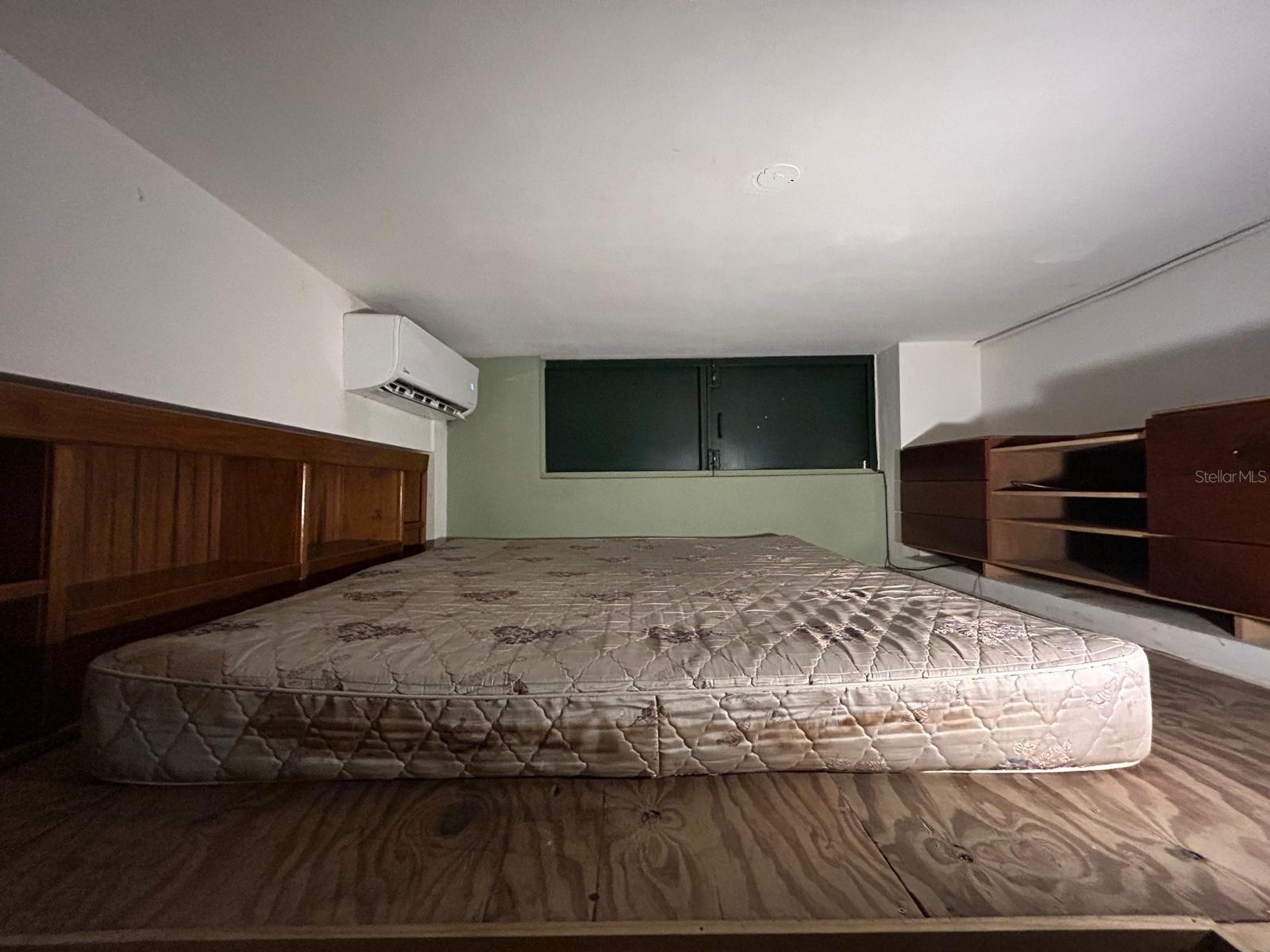 • Elevated master bedroom (mezzanine) with headboard and built-in storage.