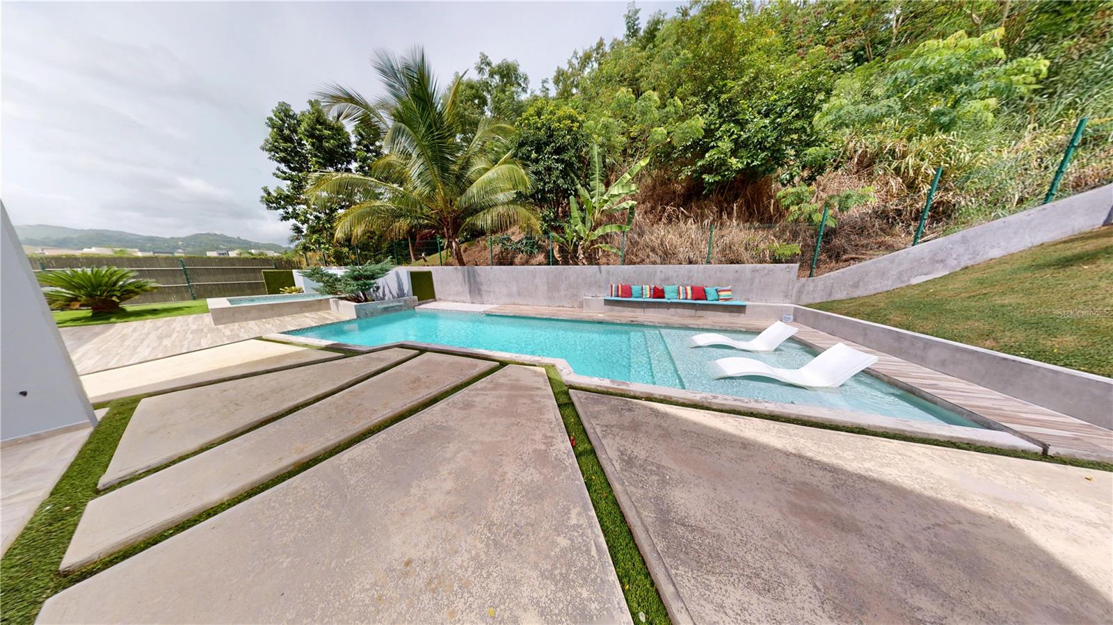 The family room opens to an extraordinary outdoor area with gardens, covered terrace, and an open-air terrace ideal for sunbathing or stargazing. The backyard provides a resort-like experience with swimming pool, jacuzzi, and full bathroom, surrounded by greenery and no rear neighbors, ensuring privacy and mountain views.