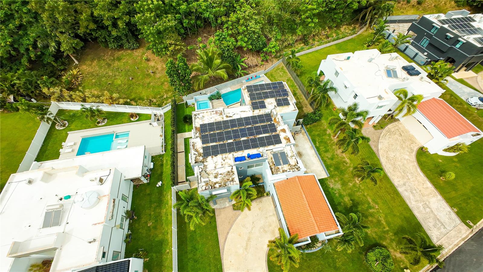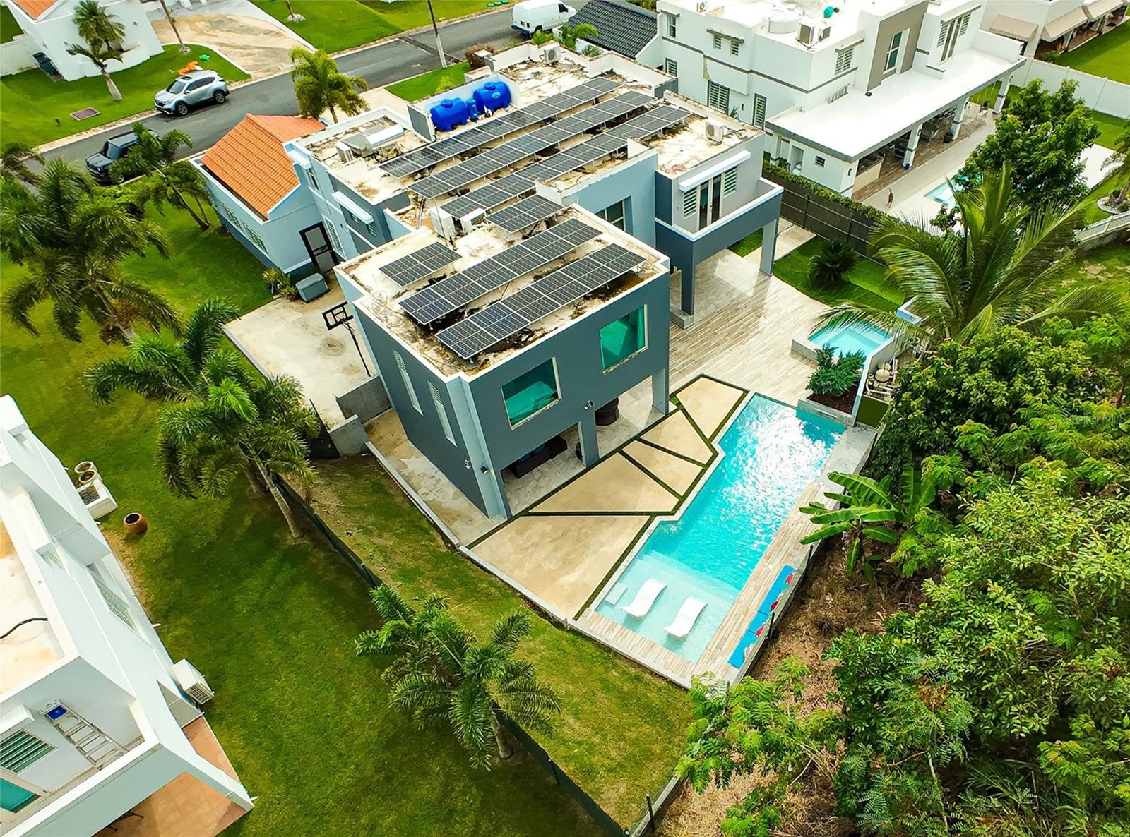 Additional features include a two-car garage, six mini-split A/C units, five ceiling fans, water cistern, solar panel system with four batteries, gas generator, solar and electric water heaters, security cameras, and high-speed Aeronet Internet.