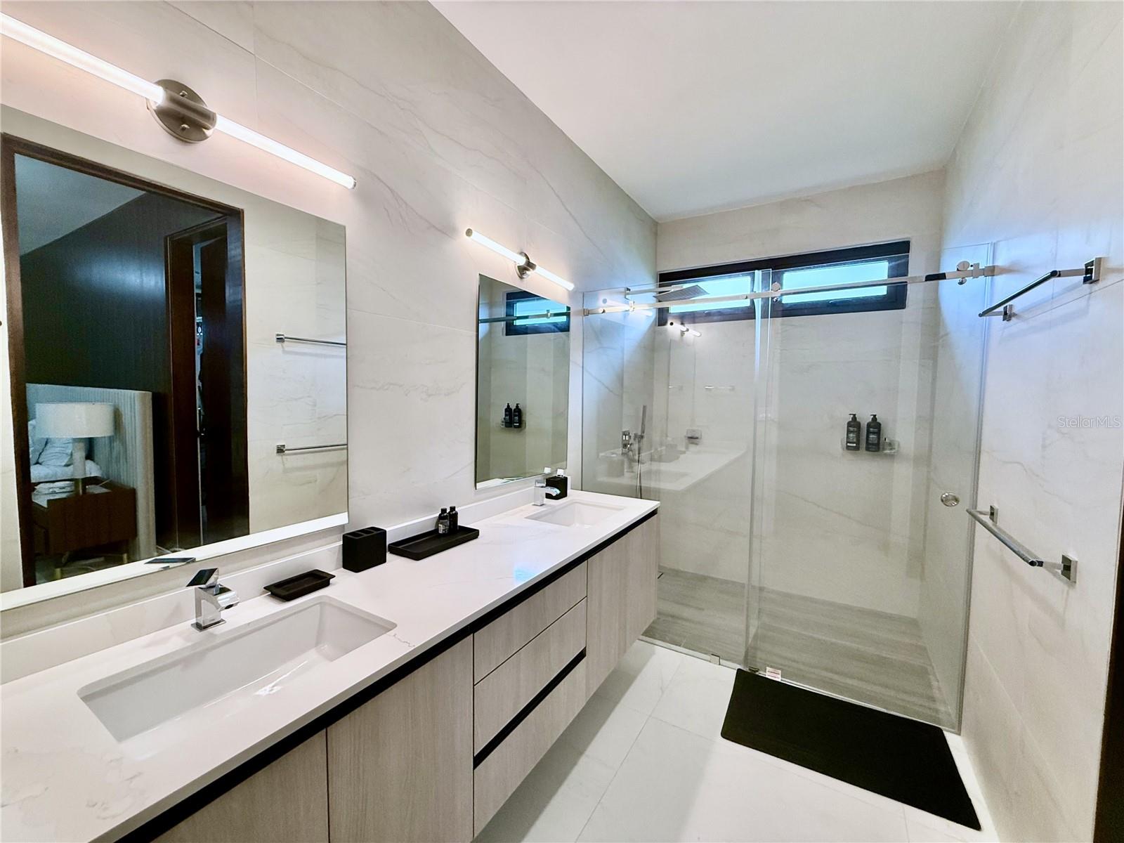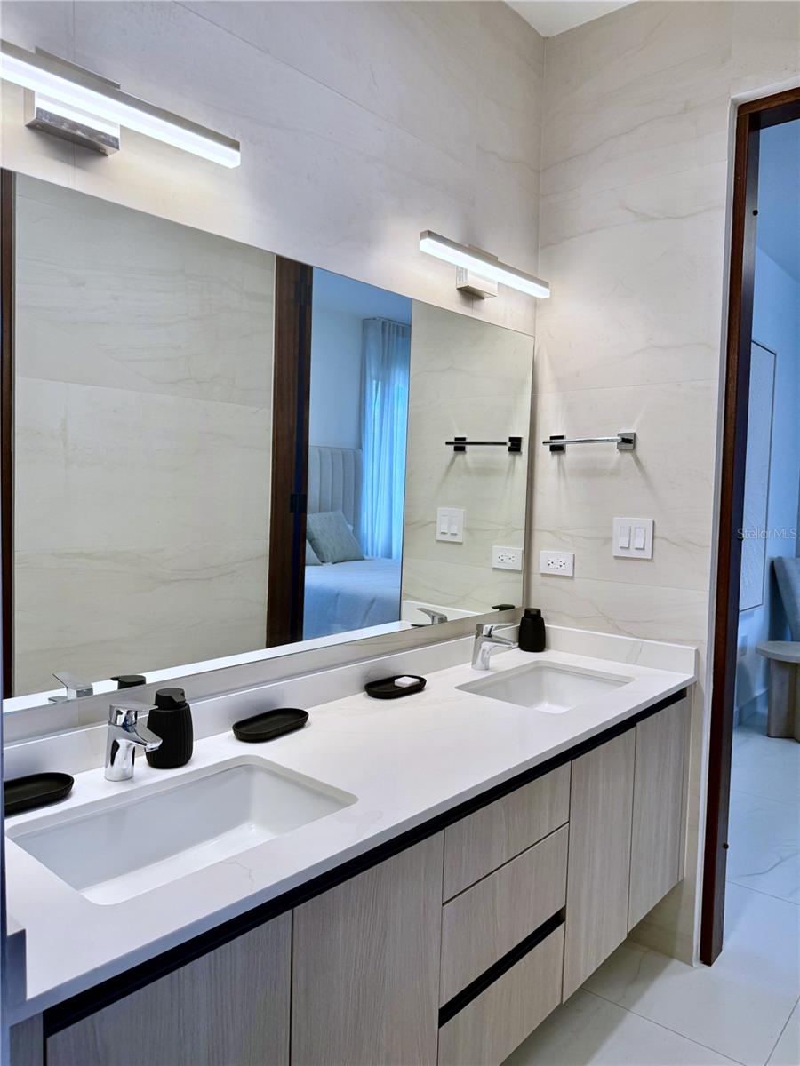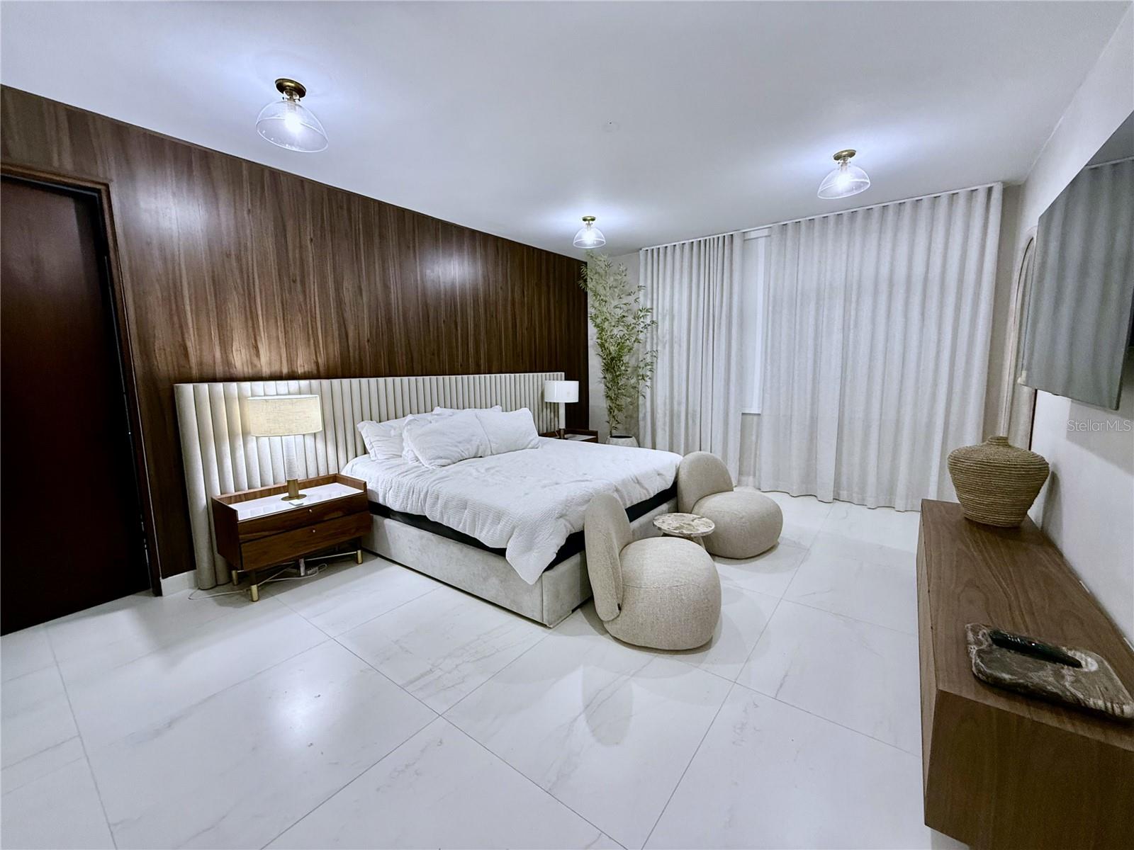 The master suite offers a luxurious ensuite bath and a custom his-and-hers California Closet. Additional features include split-unit A/C, solar water heater, and an electric car charger. Outdoor living is enhanced by a covered high-ceiling terrace, lush landscaping, and stunning sunsets.