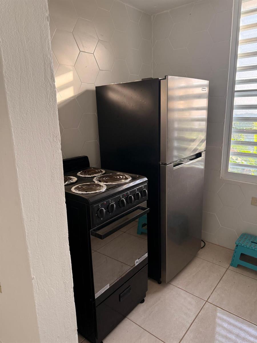 Beautiful one-bedroom apartment with a bathroom, living room, kitchen with refrigerator and stove, laundry area with washer and dryer, parking; shared electricity and water included.