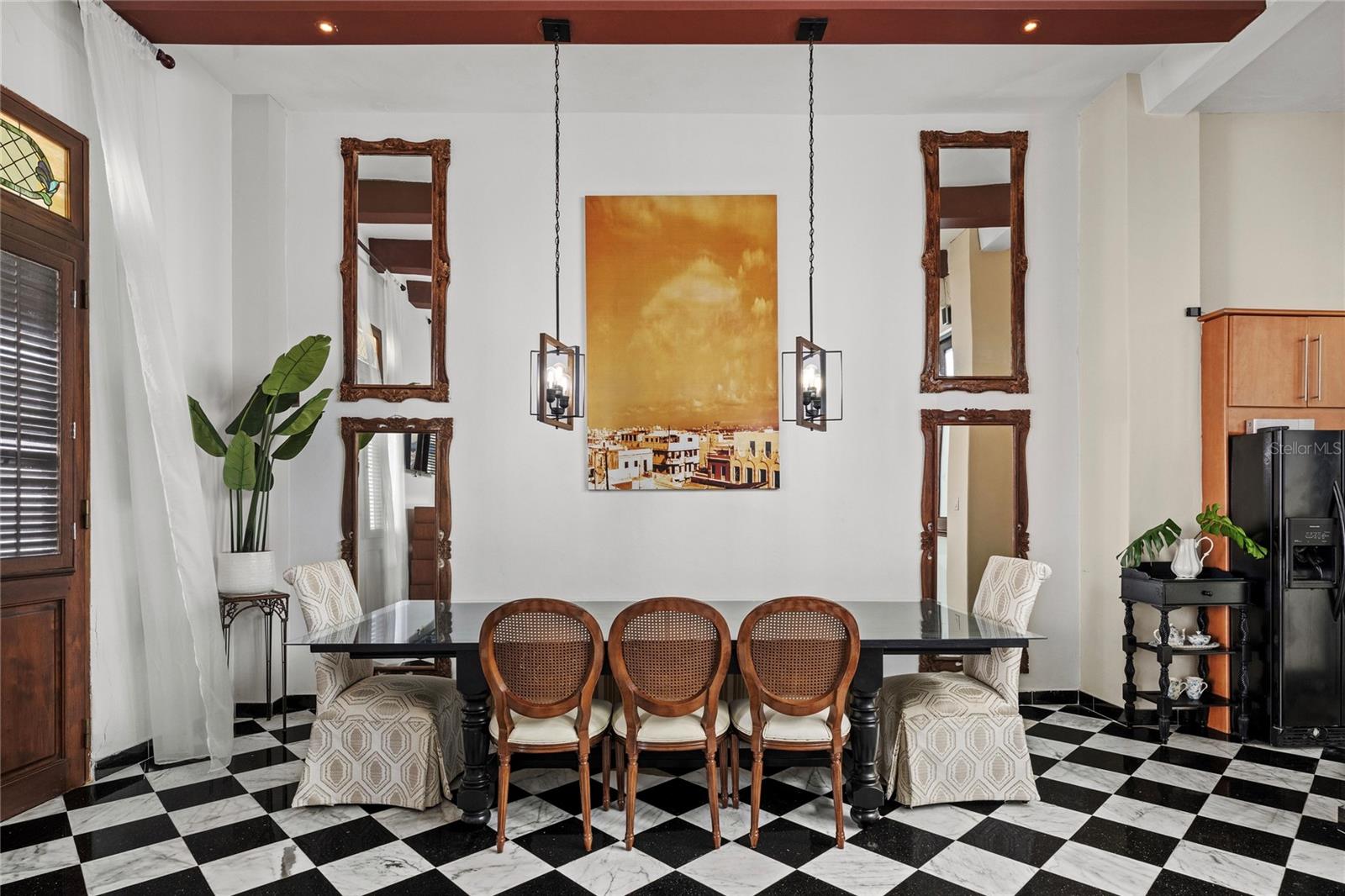 A marble corridor illuminated by star-shaped pendant lamps leads to two bedrooms, each with an en-suite bath. At the end of the hall, the living and dining rooms open toward the street-facing balconies, where the rhythm of Old San Juan life unfolds just beyond the wrought-iron railings. A bright galley kitchen completes the layout—compact, functional, and perfectly in tune with the apartment’s understated sophistication.