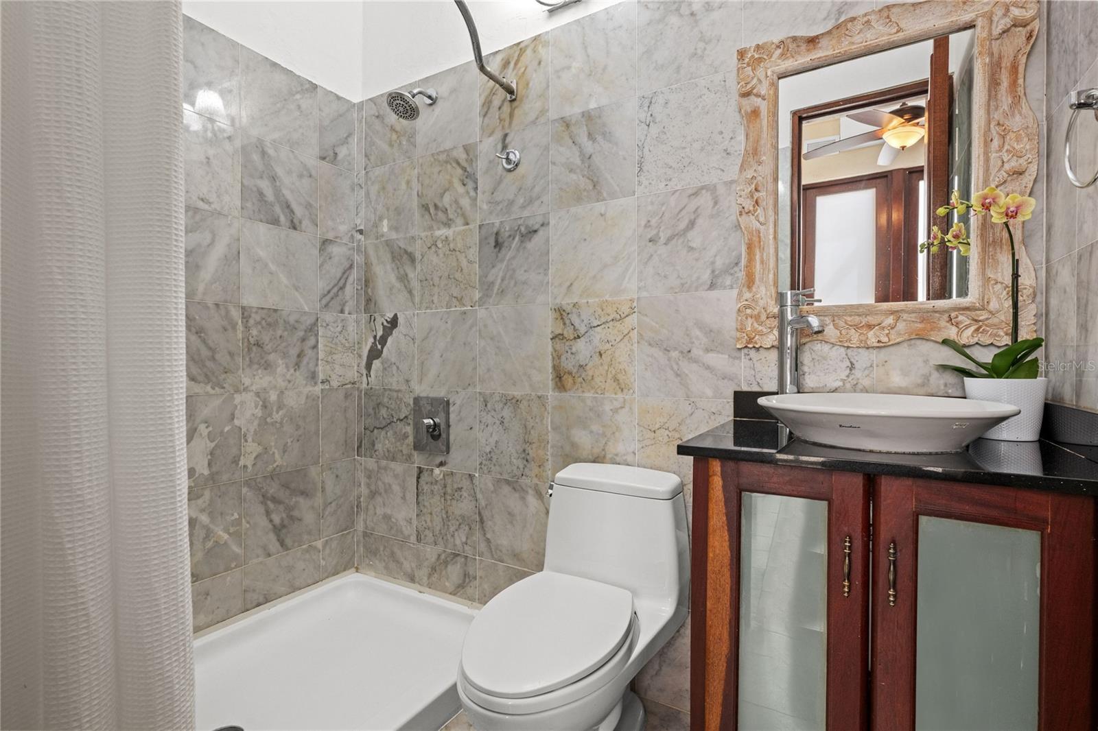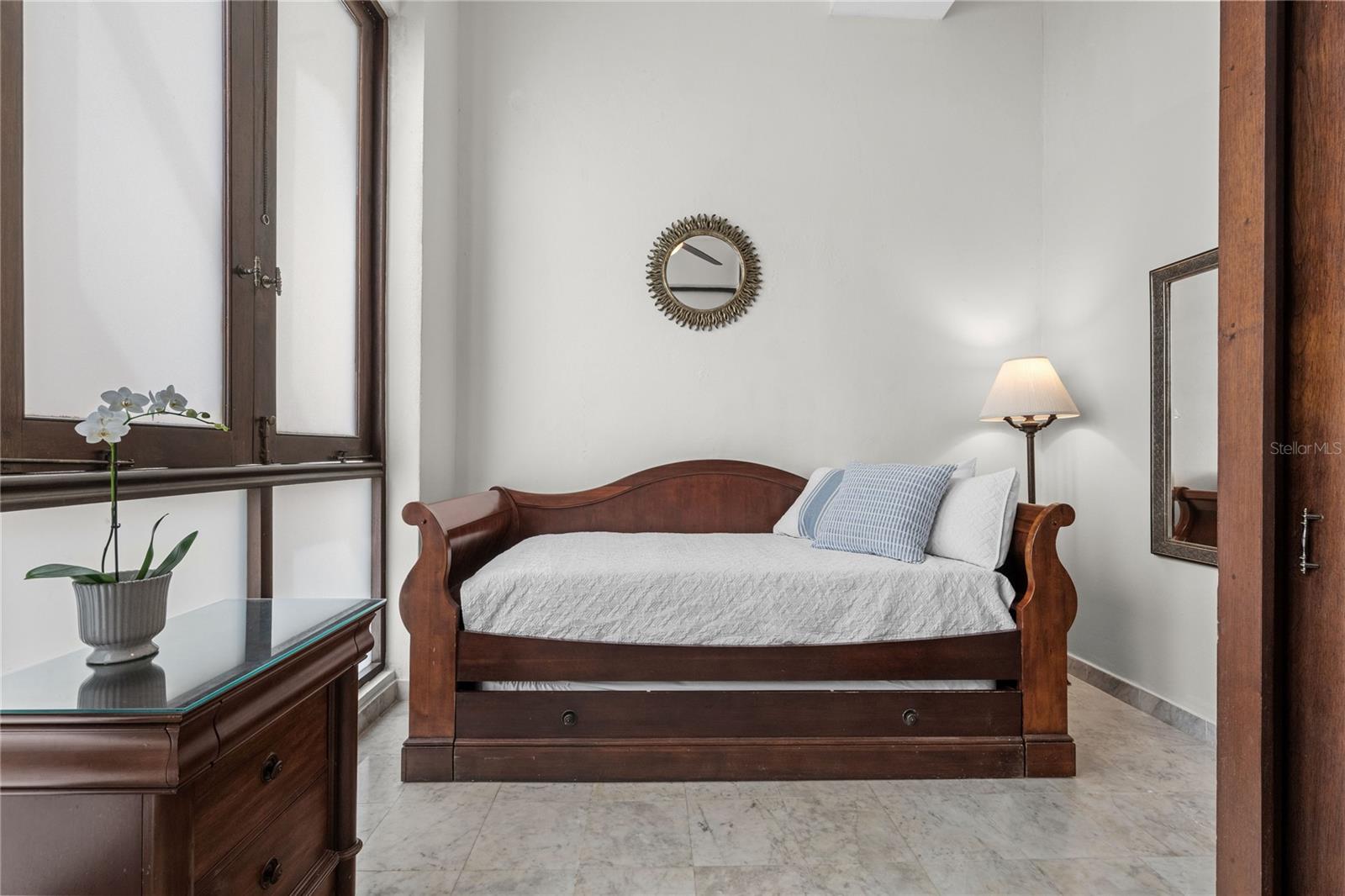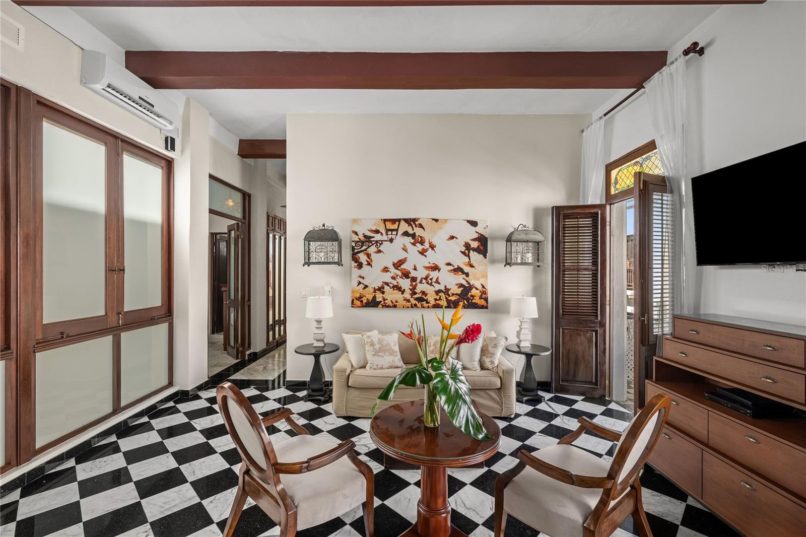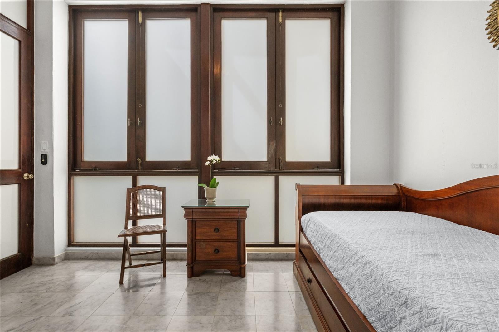 Located on the second floor of a beautifully restored four-level building on Calle Sol, this apartment embodies the history and refinement that defines Old San Juan. The structure, dating from the early 20th century, underwent a complete restoration around 2005, preserving its original architectural character—stained glass transoms, ornate ironwork, high ceilings, and classic hydraulic tile floors in the common areas—while incorporating thoughtful modernizations. Among them: a discreet, full-sized elevator, a rarity in the historic zone, and elegant interiors finished in white marble and black granite set in a timeless checkerboard pattern.