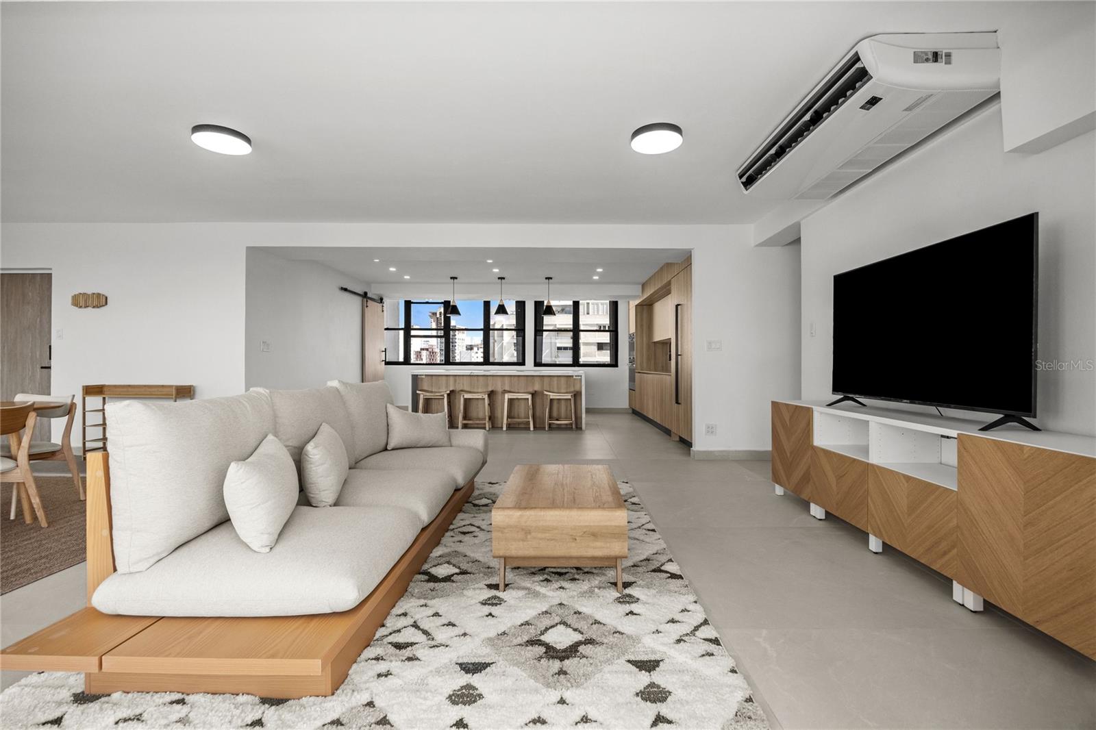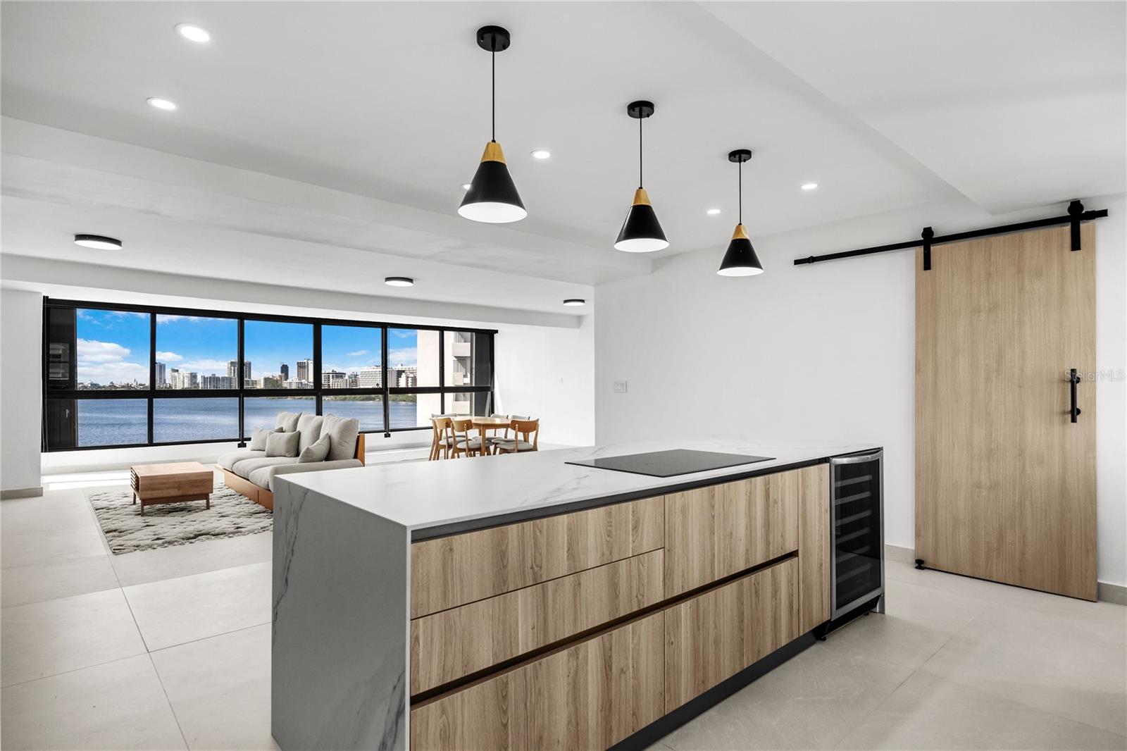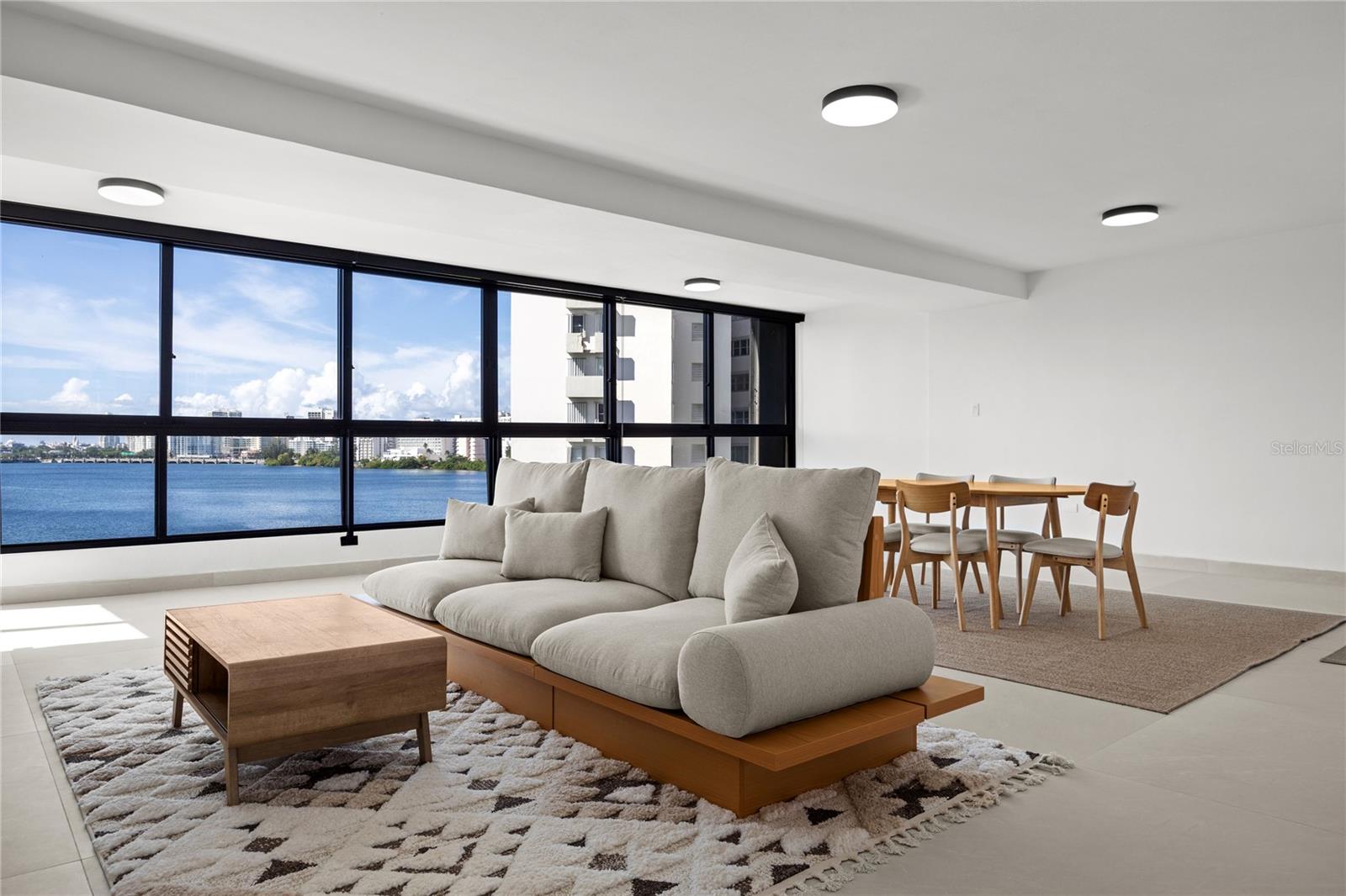 The living area is framed by custom sliding windows that open fully from end to end, allowing the tranquil and unobstructed lagoon views to become part of the interior experience. Split-unit air conditioners in every room, including the living area, ensure comfort throughout. Smart lighting, custom sun shutters, and 4x4' matte porcelain tile flooring imported from Spain complement the home’s modern ambiance.