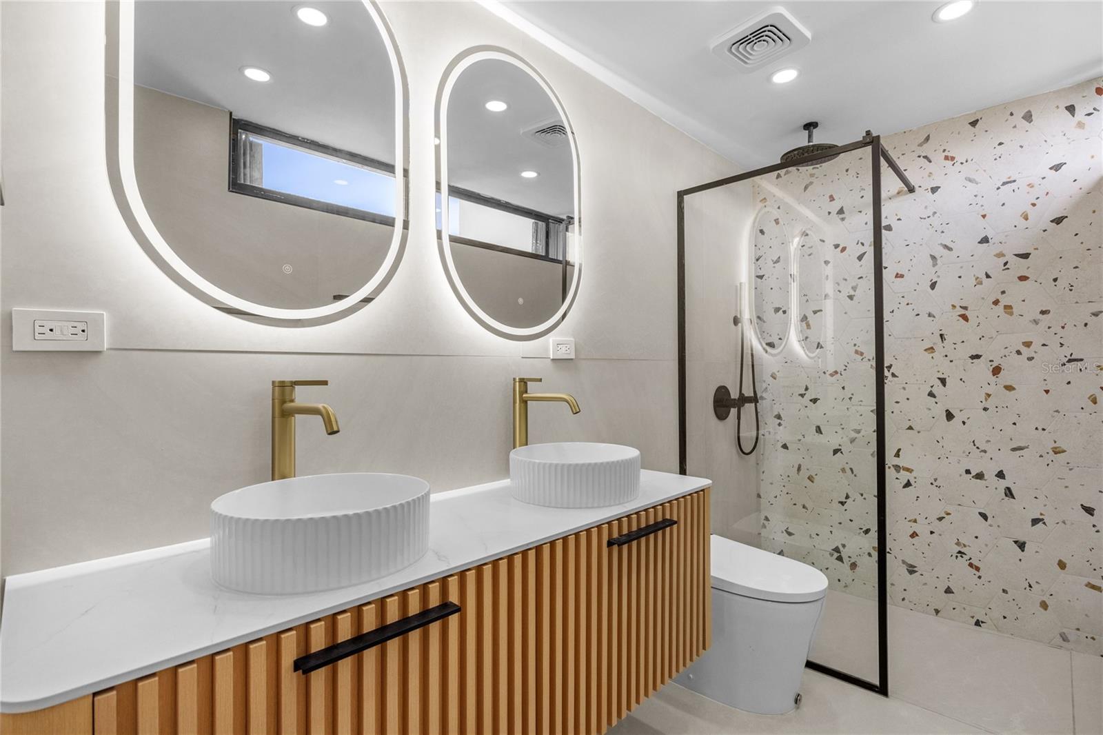 The primary suite and additional bedrooms feature custom PVC closets, offering durability and thoughtful organization. Each bathroom showcases 4x4' porcelain wall tile, accent tiles imported from Spain, Pfister rainfall and handheld showerheads, and a custom double vanity in the master suite. The building is equipped with a partial backup generator for added convenience and reliability.