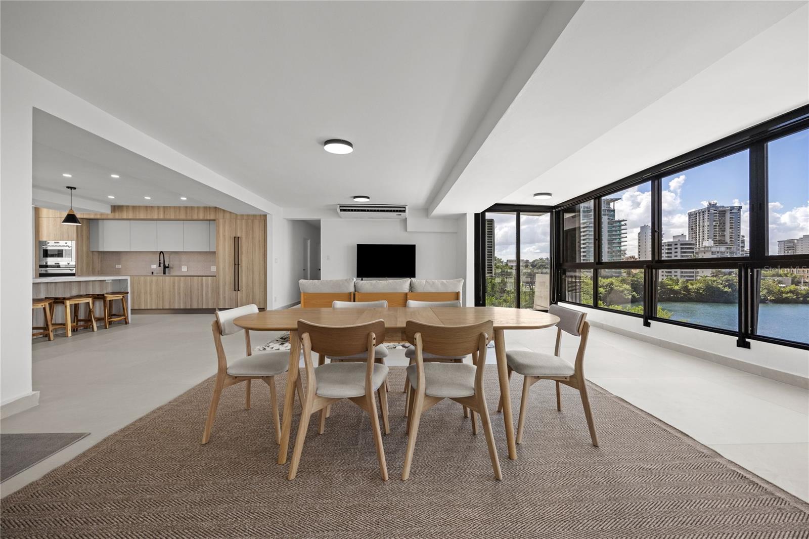 The living area is framed by custom sliding windows that open fully from end to end, allowing the tranquil and unobstructed lagoon views to become part of the interior experience. Split-unit air conditioners in every room, including the living area, ensure comfort throughout. Smart lighting, custom sun shutters, and 4x4' matte porcelain tile flooring imported from Spain complement the home’s modern ambiance.