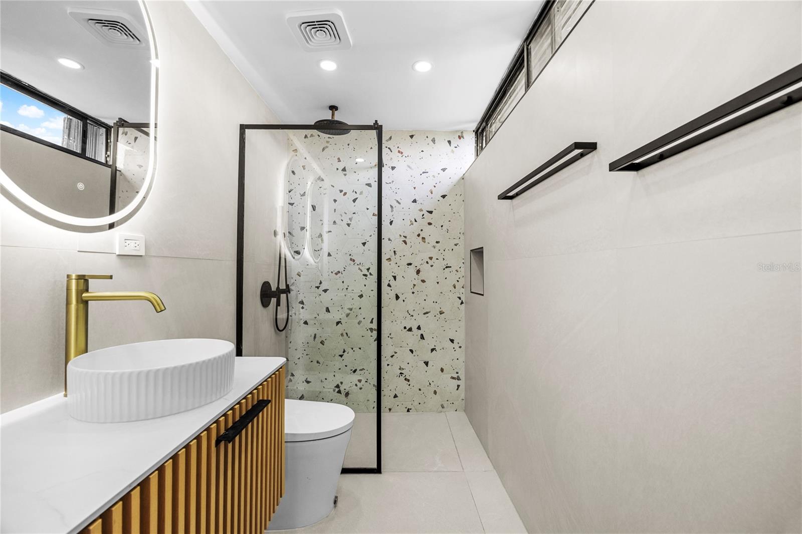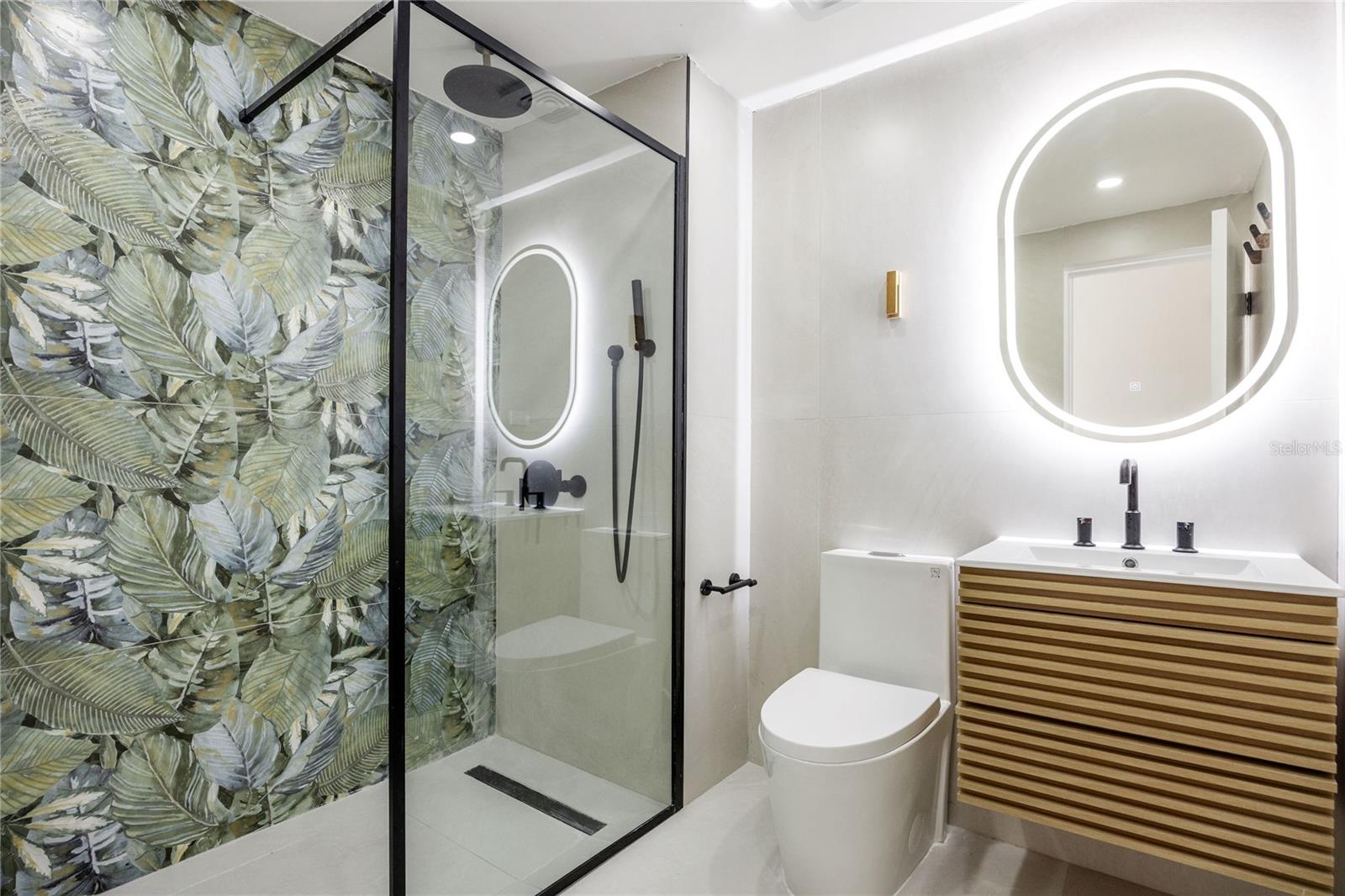 The primary suite and additional bedrooms feature custom PVC closets, offering durability and thoughtful organization. Each bathroom showcases 4x4' porcelain wall tile, accent tiles imported from Spain, Pfister rainfall and handheld showerheads, and a custom double vanity in the master suite. The building is equipped with a partial backup generator for added convenience and reliability.