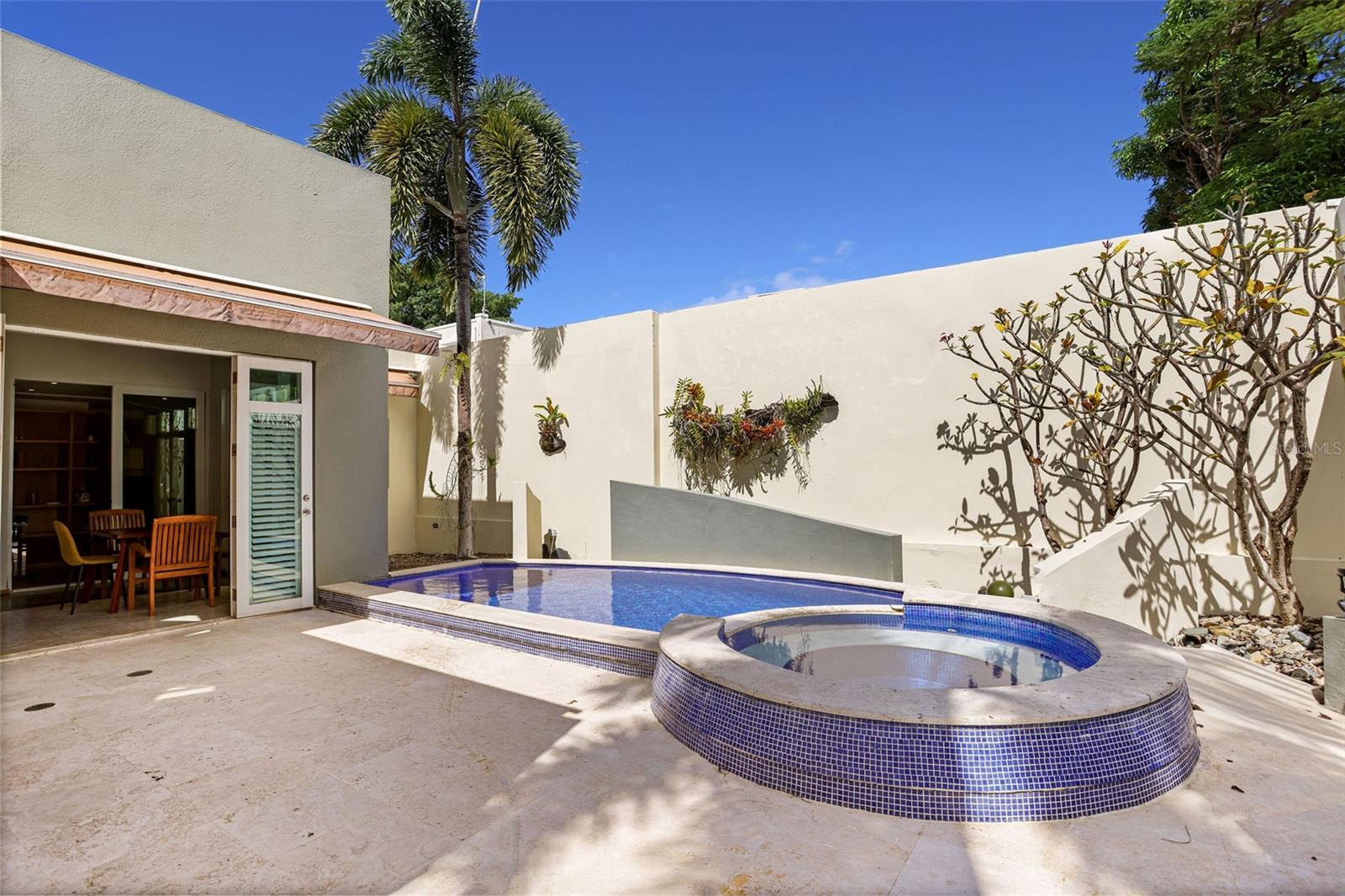 Designed for seamless indoor–outdoor living, wide doors open to a private courtyard with pool and spa, covered terrace, and service bar for effortless entertaining. Bedrooms are spacious and serene, offering retreat-like comfort. Everyday peace of mind comes with a full-house generator, cistern, and 24-hour community security.