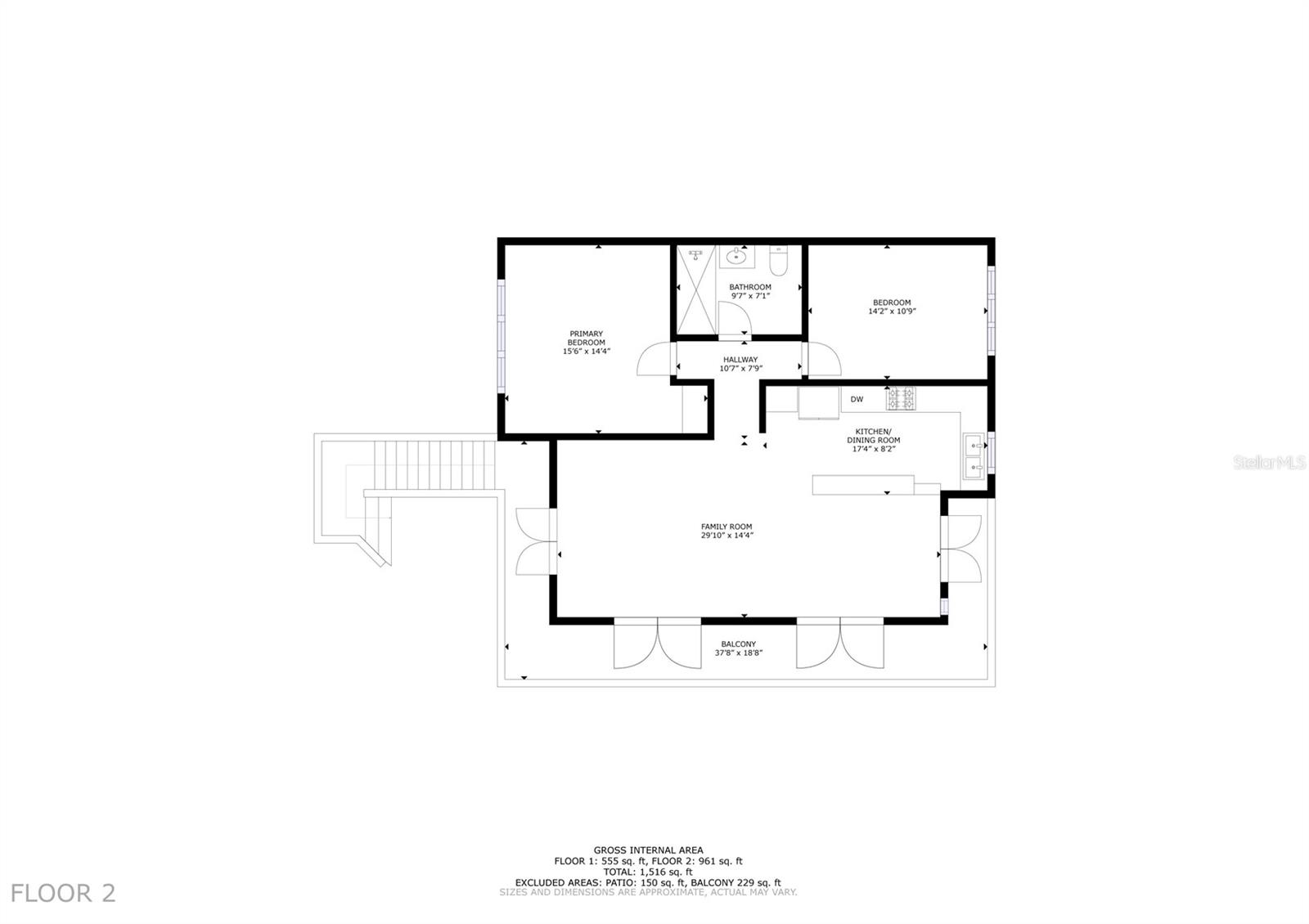 Kitchen, Bedroom 2, Bathroom 2, Balcony/Porch/Lanai, Primary Bedroom, Living Room